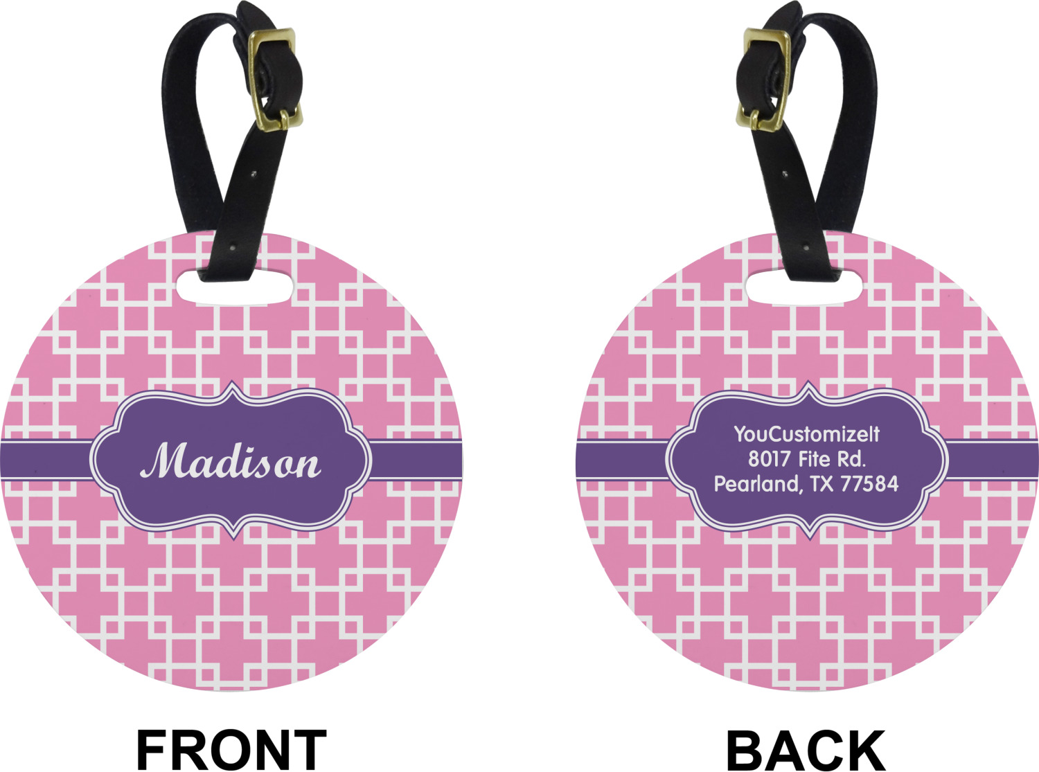 These personalized bag tags are sold in a variety of shapes, so that you may find the product that meets your vision exactly. We sell a round luggage tag, which measures at approximately 4" x 4". Our square luggage tag is about 3.5" x 3.5", while our rectangular version is 2.75" x 4 ".