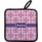 Our personalized pot holders feature a neoprene front that displays your personalization in vibrant colors. The backing of the hot pot holder is rubberized; the textured backing allows you to have a great grip when using this custom pot holder. The two materials are joined with a sleek, black trim, and the holder also includes an attached loop for hanging and storage. The pot holder is approximately 8.75 inches by 8.75 inches and 0.25 inches tall, while the fabric loop is 2.5 inches long. You can purchase a kitchen pot holder by itself or as a set of 2. We also offer a set including one pot holder and one oven mitt.