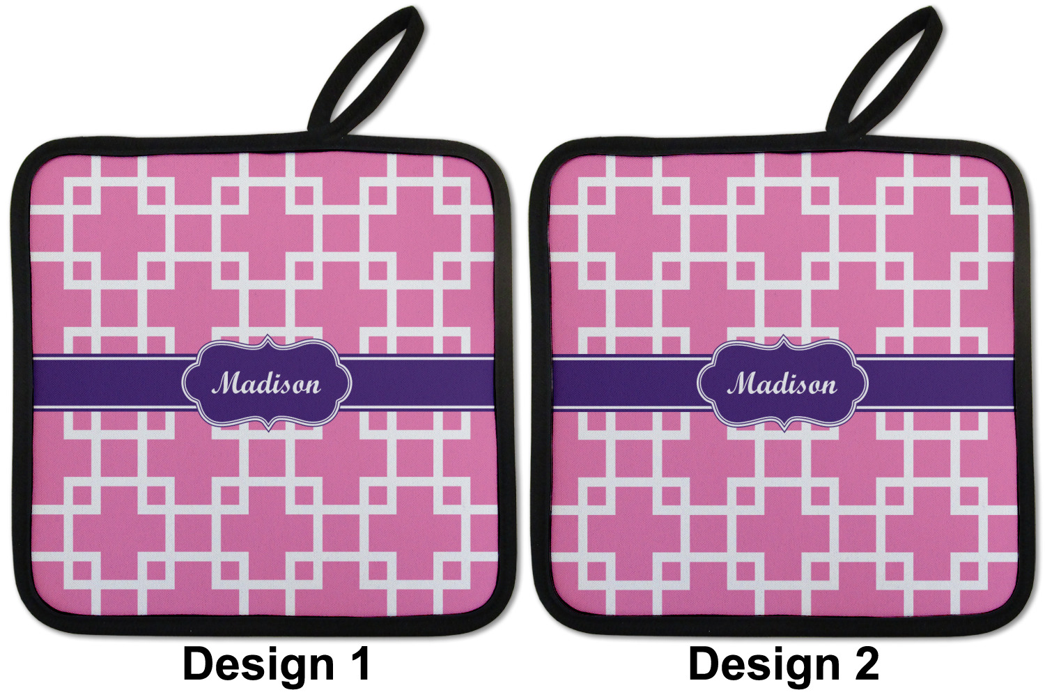 Our personalized pot holders feature a neoprene front that displays your personalization in vibrant colors. The backing of the hot pot holder is rubberized; the textured backing allows you to have a great grip when using this custom pot holder. The two materials are joined with a sleek, black trim, and the holder also includes an attached loop for hanging and storage. The pot holder is approximately 8.75 inches by 8.75 inches and 0.25 inches tall, while the fabric loop is 2.5 inches long. You can purchase a kitchen pot holder by itself or as a set of 2. We also offer a set including one pot holder and one oven mitt.