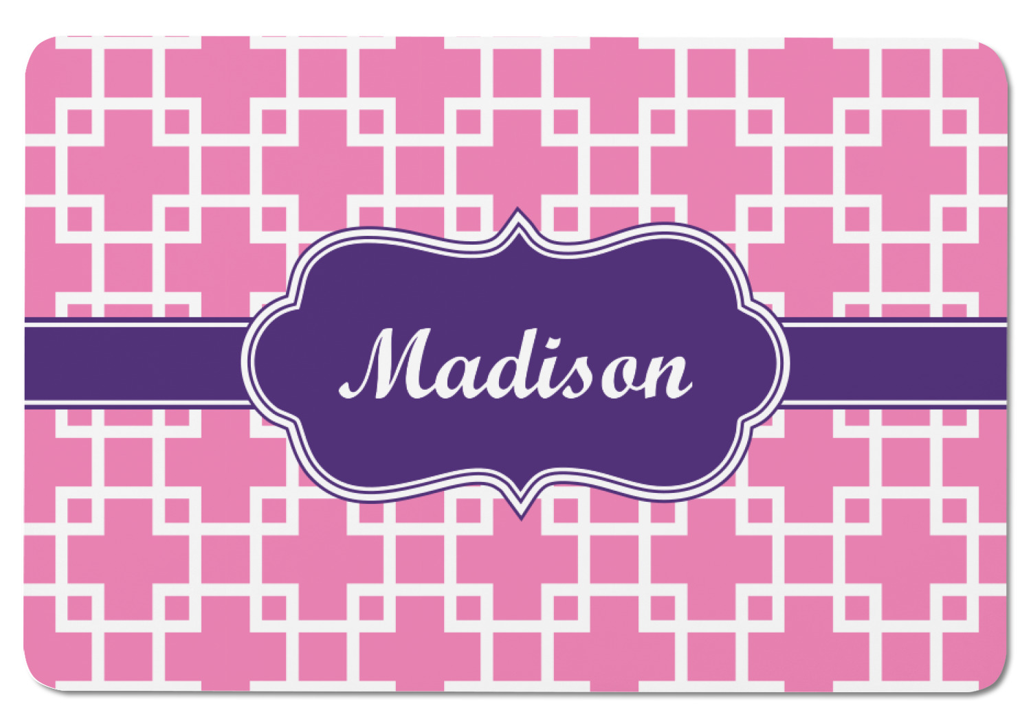 This design that is shown is a pink background with white squares, however it is available in multiple colors. We also chose to use a classic ribbon and a decorative rectangular label in purple. Ribbon and Labels are also available in multiple colors.