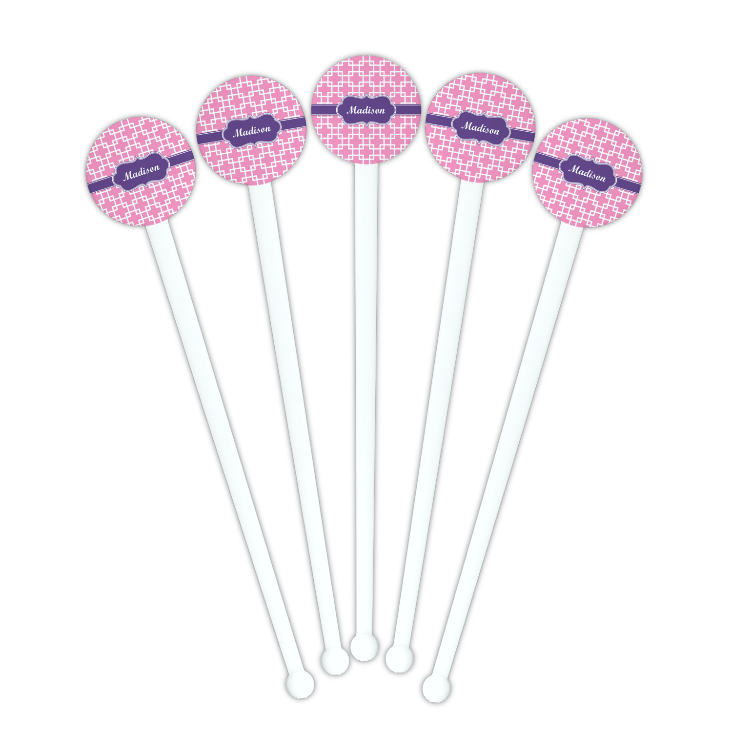 This design that is shown is a pink background with white squares, however it is available in multiple colors. We also chose to use a classic ribbon and a decorative rectangular label in purple. Ribbon and Labels are also available in multiple colors.