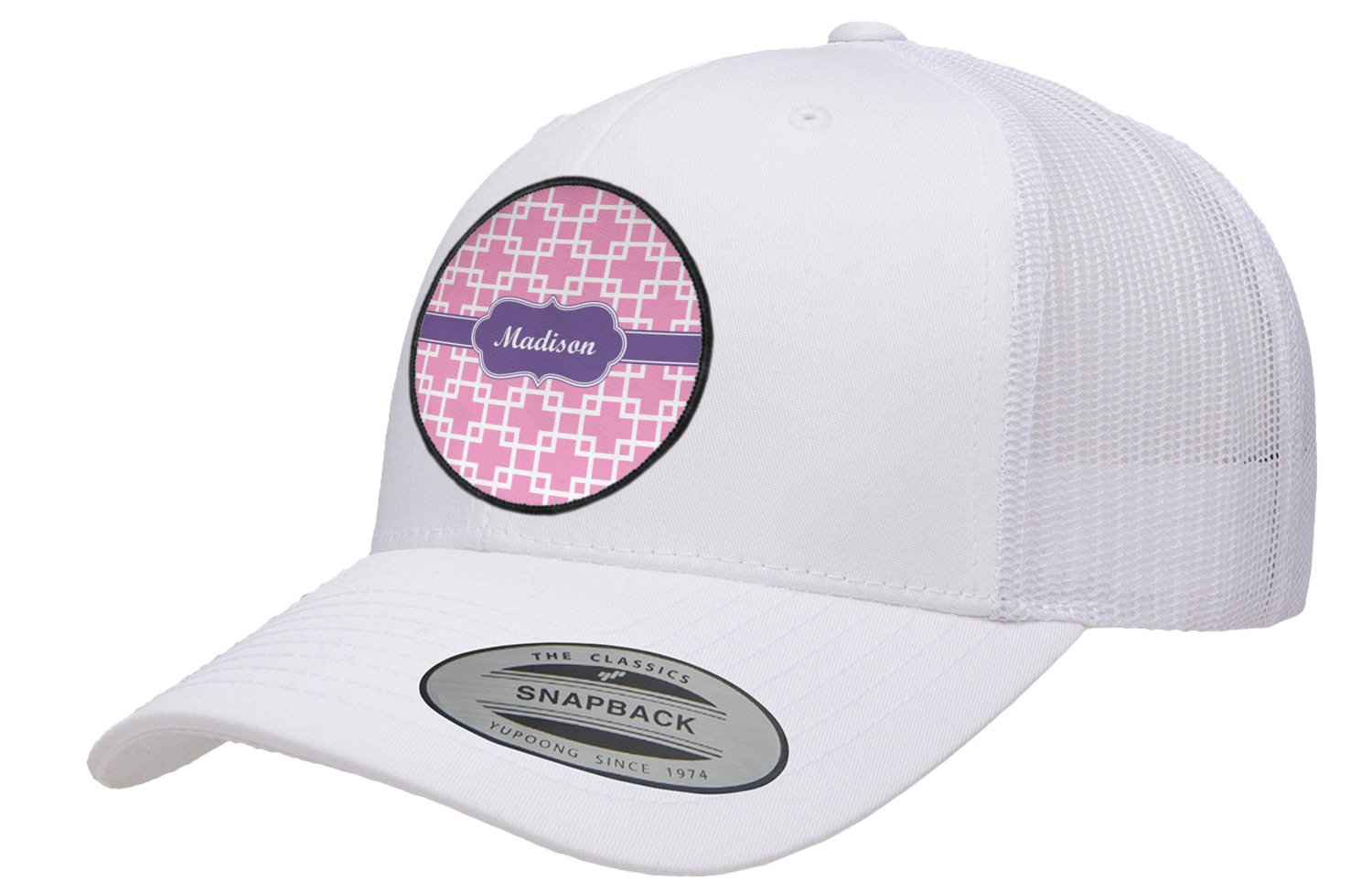 This design that is shown is a pink background with white squares, however it is available in multiple colors. We also chose to use a classic ribbon and a decorative rectangular label in purple. Ribbon and Labels are also available in multiple colors.