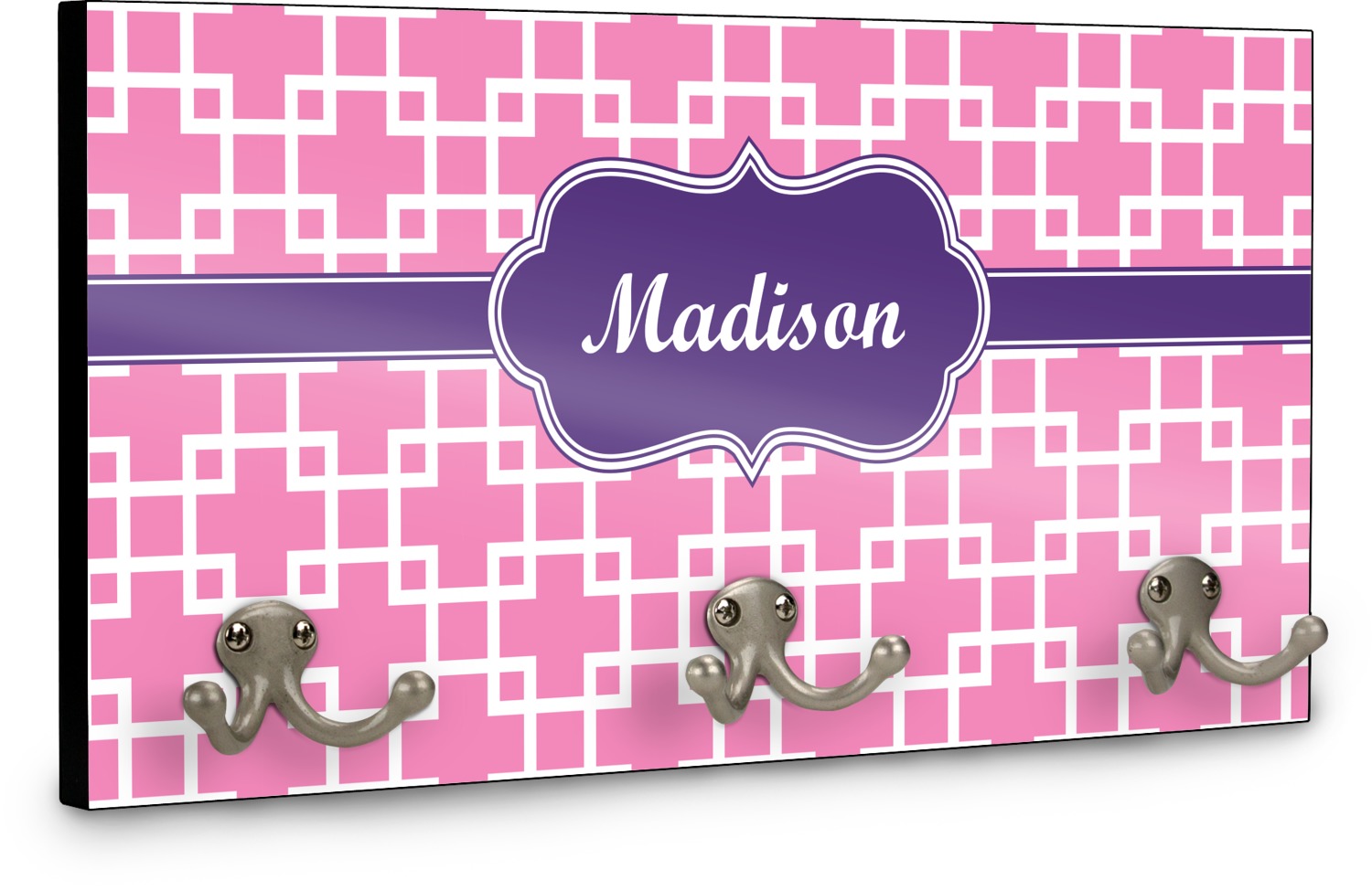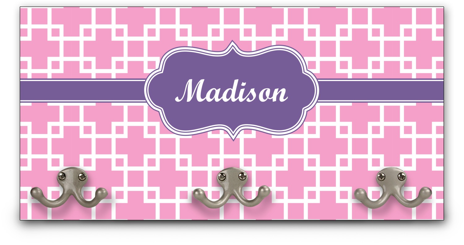This coat rack is the perfect way to add some personality to your wall or entryway. The board is made of a strong maple that is approximately 16" x 8". The three 2-prong hooks are a sturdy metal that have three screws attaching them to the board. Your design is printed right onto the front of the board while the back and sides are a simple black.