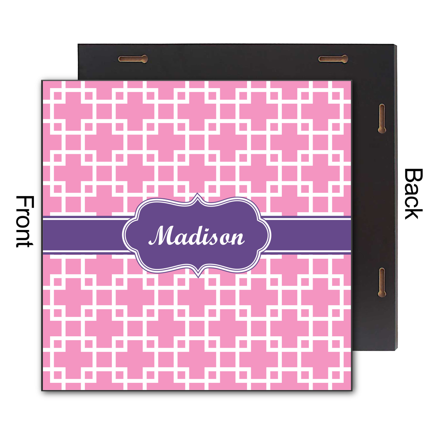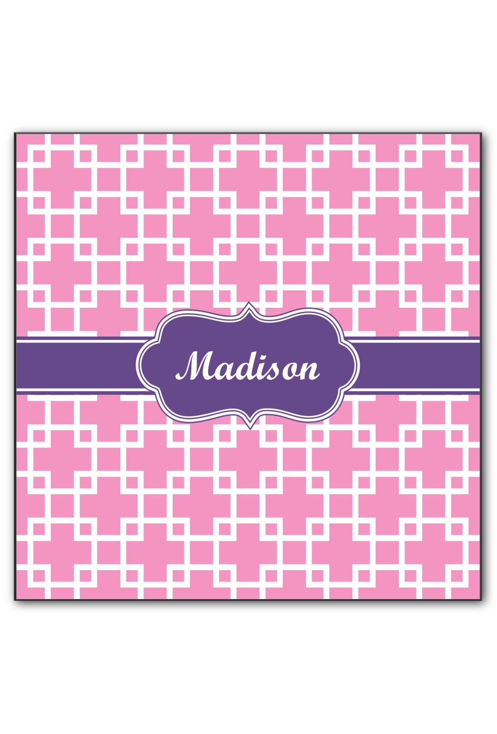 This design that is shown is a pink background with white squares, however it is available in multiple colors. We also chose to use a classic ribbon and a decorative rectangular label in purple. Ribbon and Labels are also available in multiple colors.
