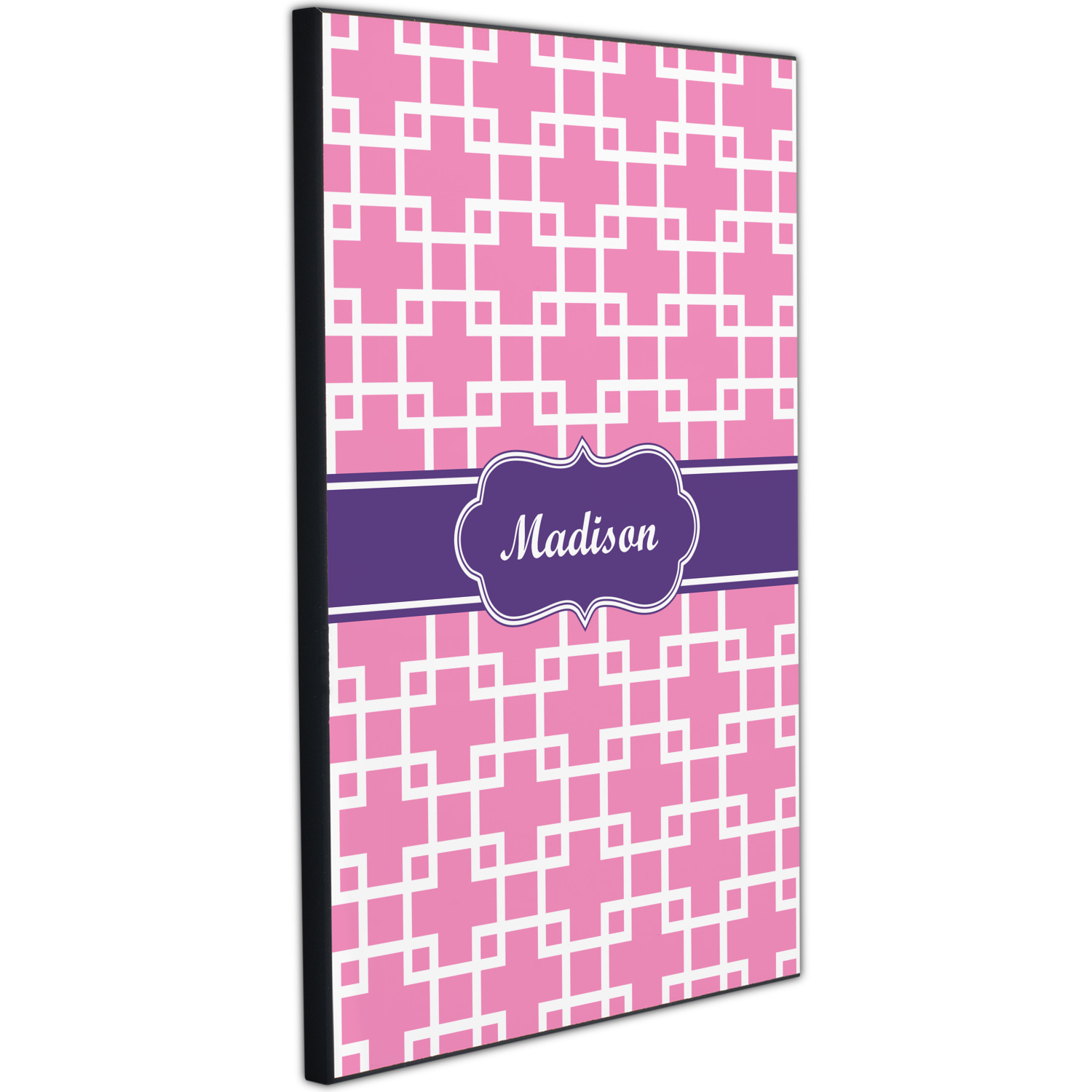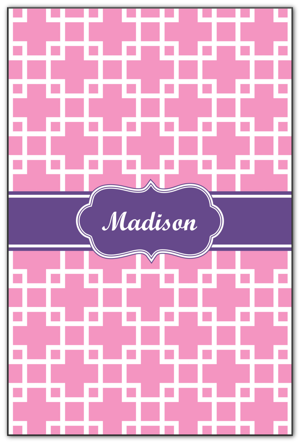 This design that is shown is a pink background with white squares, however it is available in multiple colors. We also chose to use a classic ribbon and a decorative rectangular label in purple. Ribbon and Labels are also available in multiple colors.