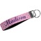 These key fob keychains are made from a polyester weave, right here in the USA. They feature a silver, metal clasp, attached to a round keyring. The piece gives the personalized wristlet a beautiful, finished look. Your customized design is printed on the outside of the keychain strap. We carry these wristlets in two sizes: small, which is 5 inches in width, and large, which is 5.5 inches in width.