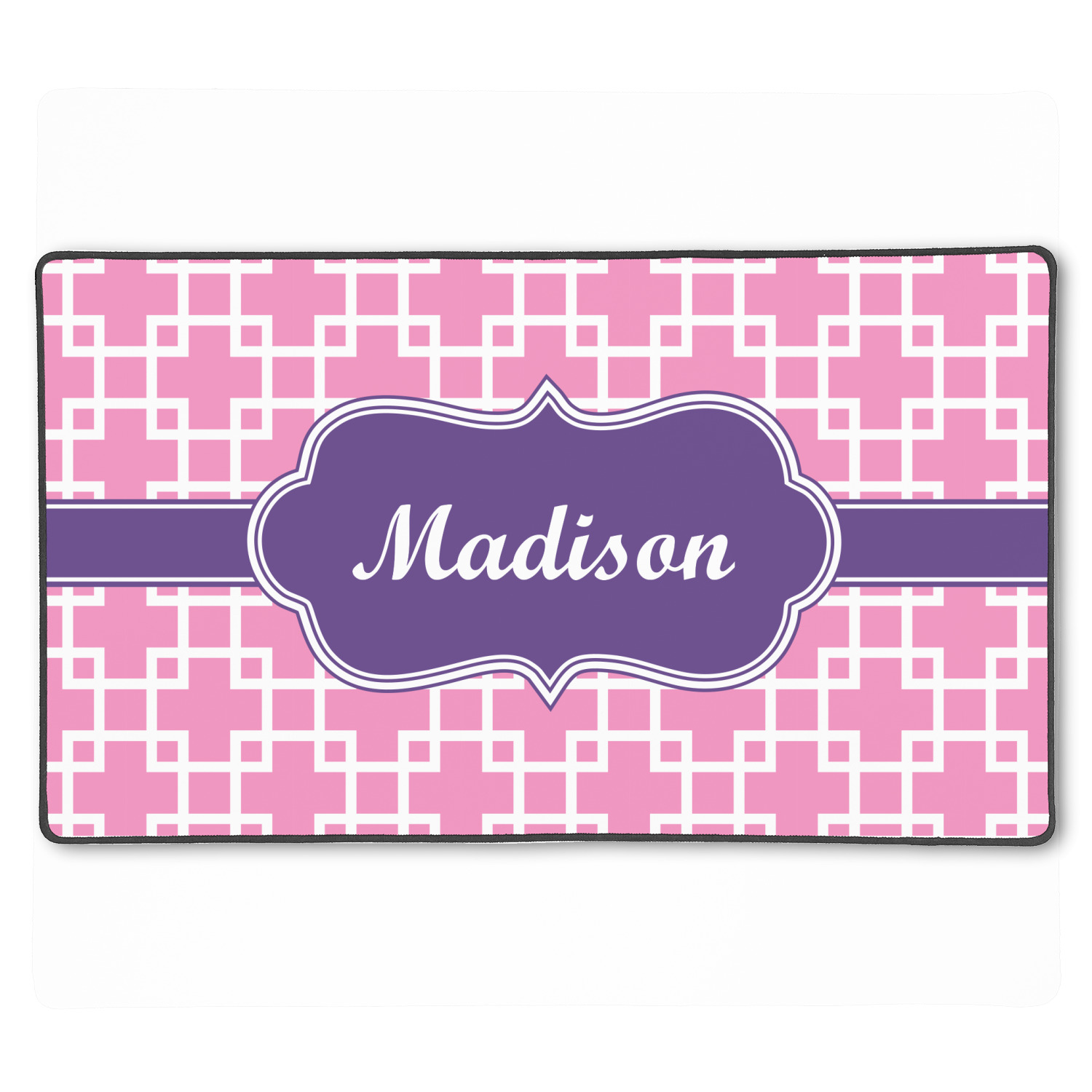This design that is shown is a pink background with white squares, however it is available in multiple colors. We also chose to use a classic ribbon and a decorative rectangular label in purple. Ribbon and Labels are also available in multiple colors.