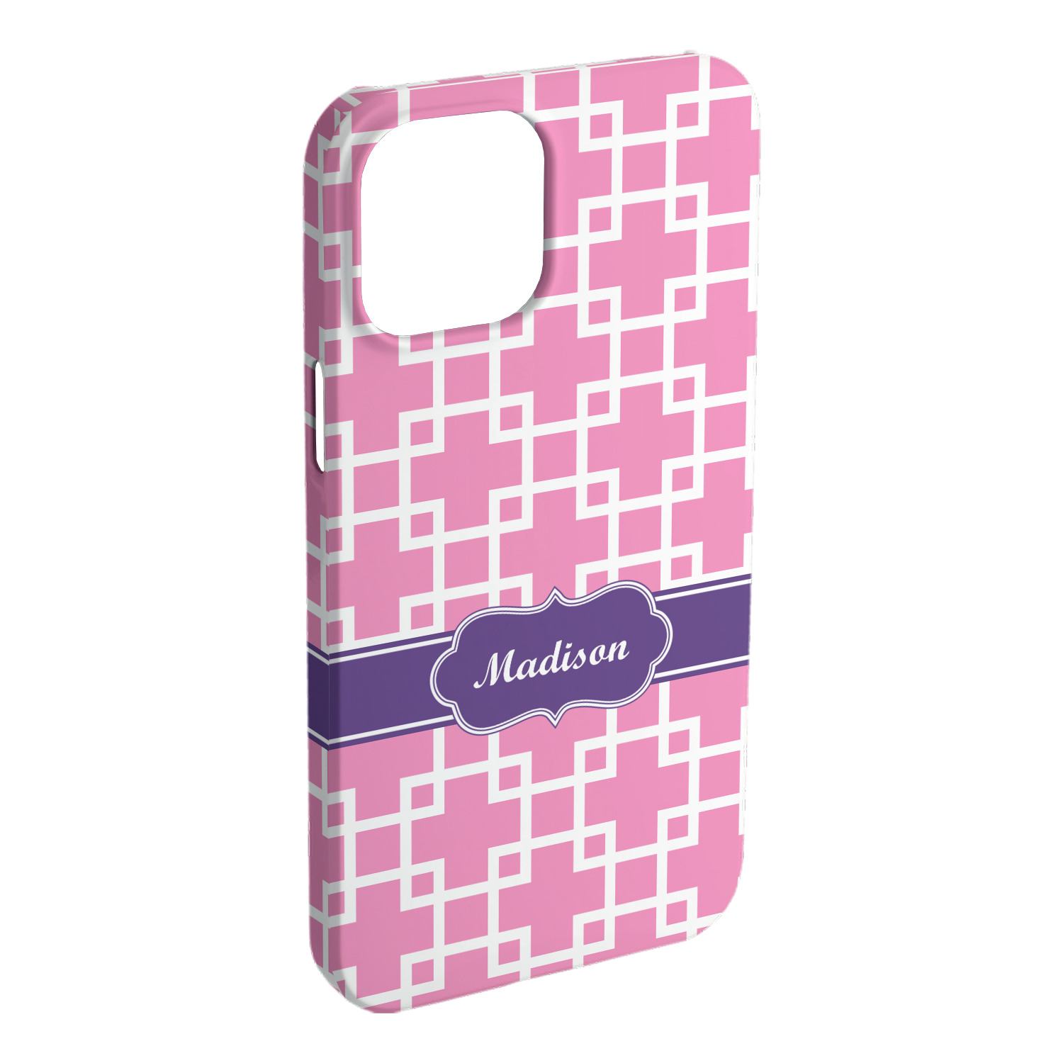 This design that is shown is a pink background with white squares, however it is available in multiple colors. We also chose to use a classic ribbon and a decorative rectangular label in purple. Ribbon and Labels are also available in multiple colors.