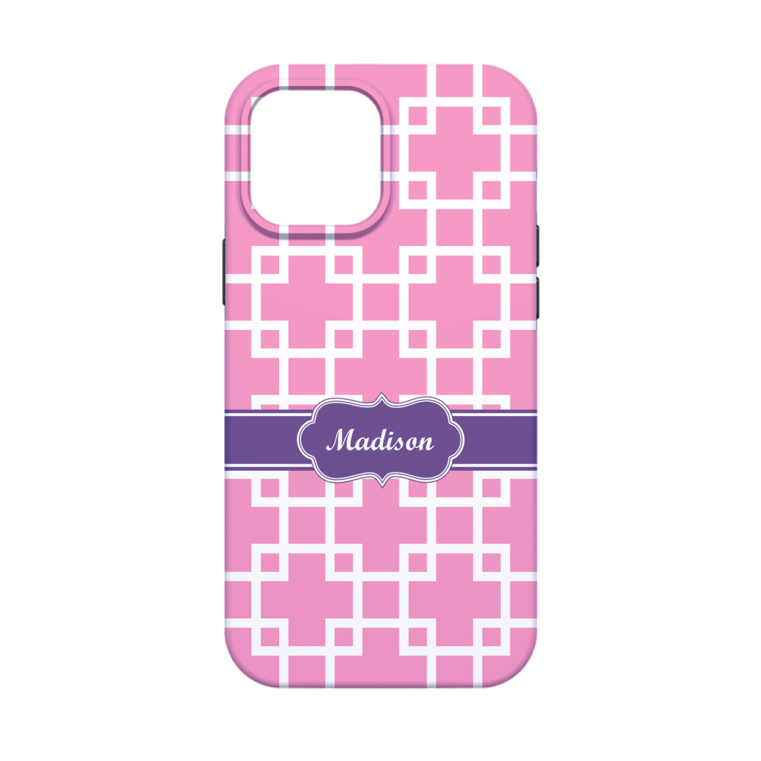This design that is shown is a pink background with white squares, however it is available in multiple colors. We also chose to use a classic ribbon and a decorative rectangular label in purple. Ribbon and Labels are also available in multiple colors.