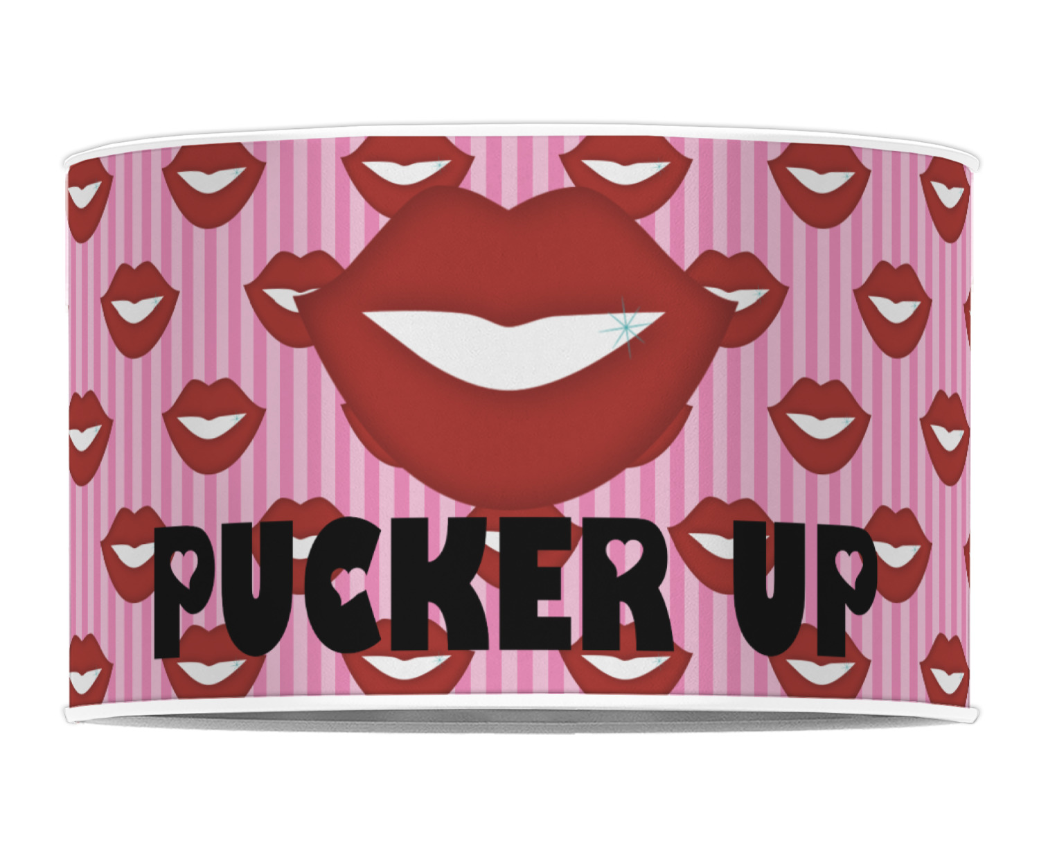 This Lips / Pucker Up design was created by very own Tina D'Astoli for her make up bag. We thought it was beautiful enough to convert to a full fledged design for all our products. It is a layered design with striped in the background (Tina of course chose pink; the stripes are re-color-able), layered with lips. Tina also chose to the use a large graphic and text layout - with lips and the words "Pucker Up" in a black with the Holes are Hearts font.