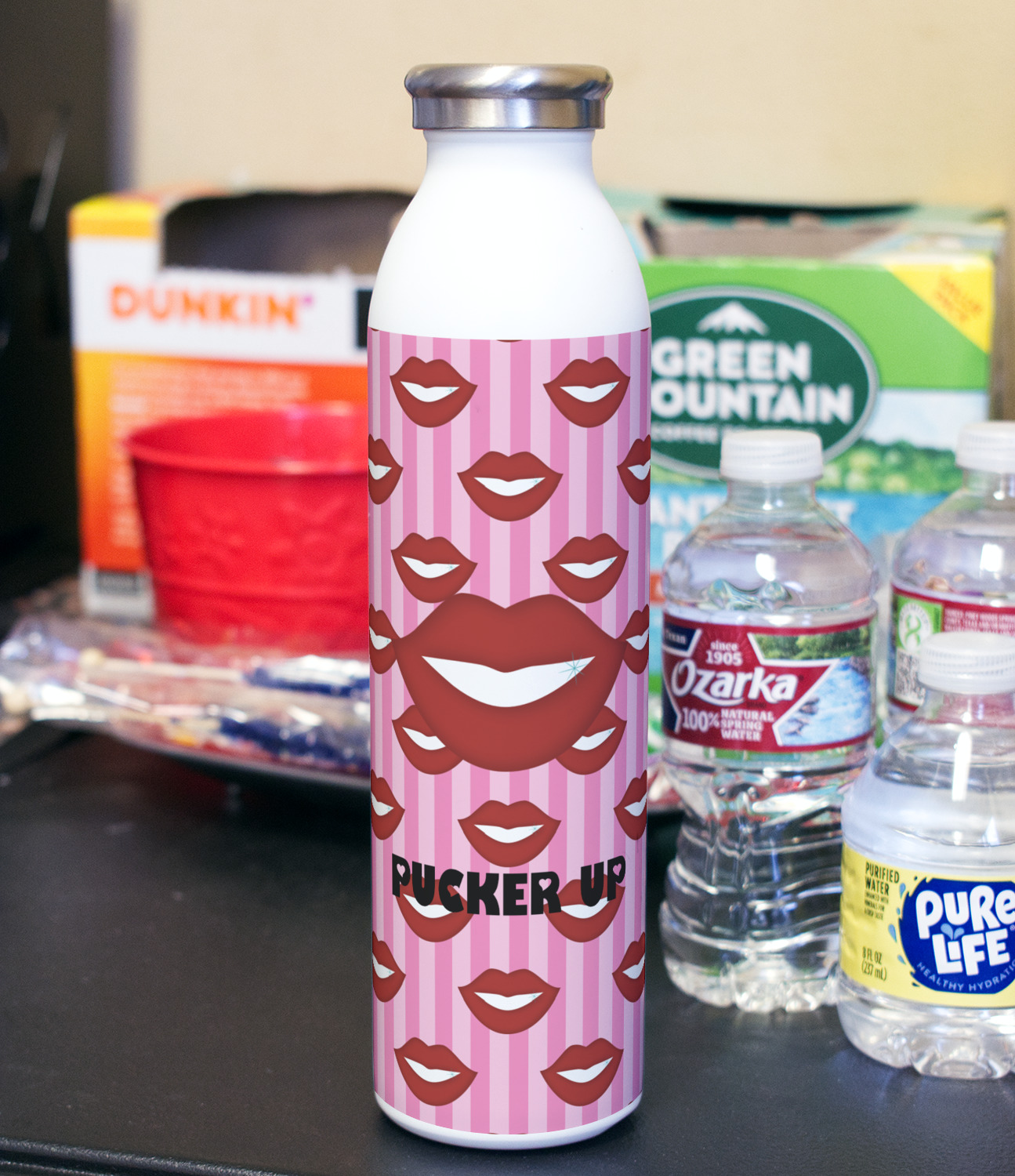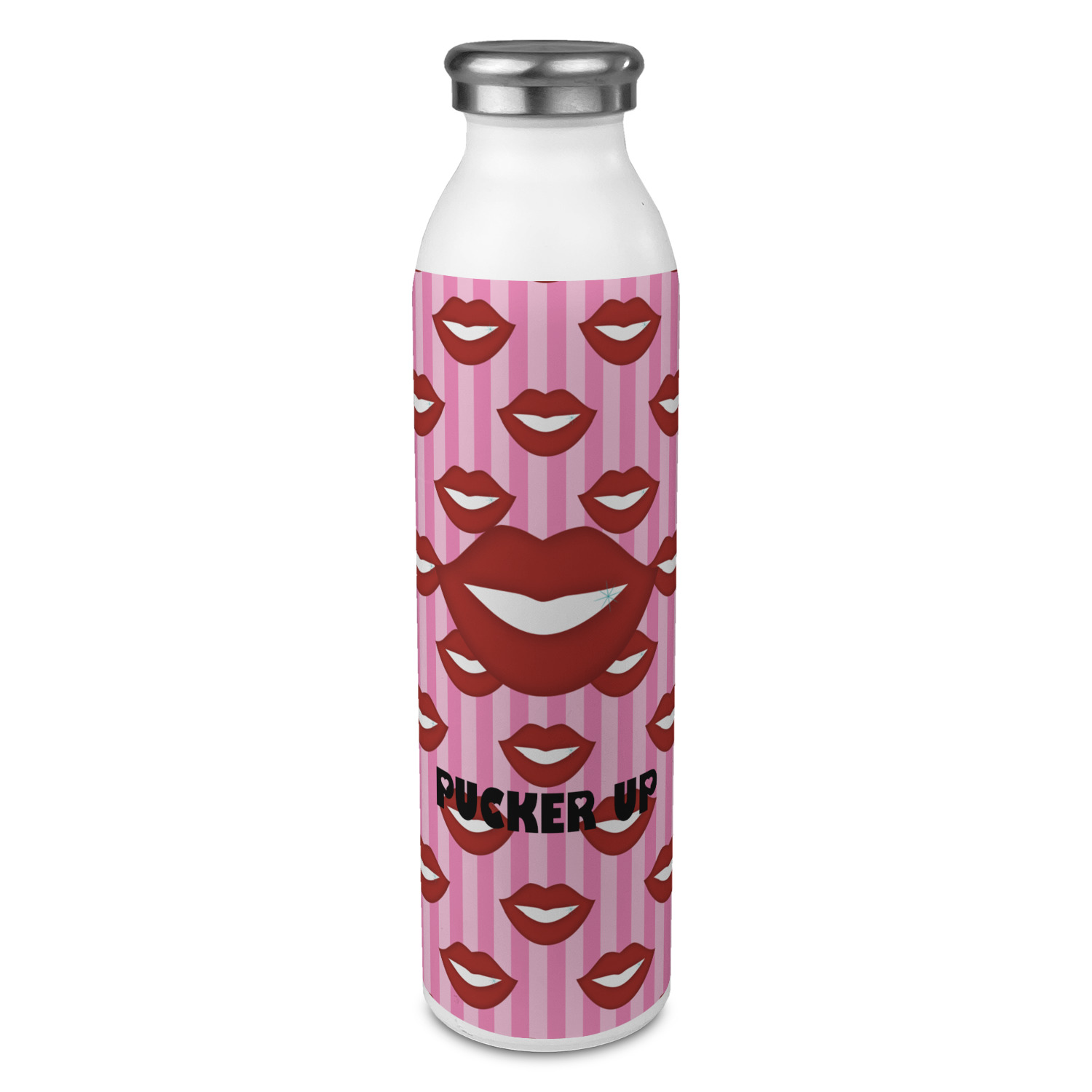 This Lips / Pucker Up design was created by very own Tina D'Astoli for her make up bag. We thought it was beautiful enough to convert to a full fledged design for all our products. It is a layered design with striped in the background (Tina of course chose pink; the stripes are re-color-able), layered with lips. Tina also chose to the use a large graphic and text layout - with lips and the words "Pucker Up" in a black with the Holes are Hearts font.