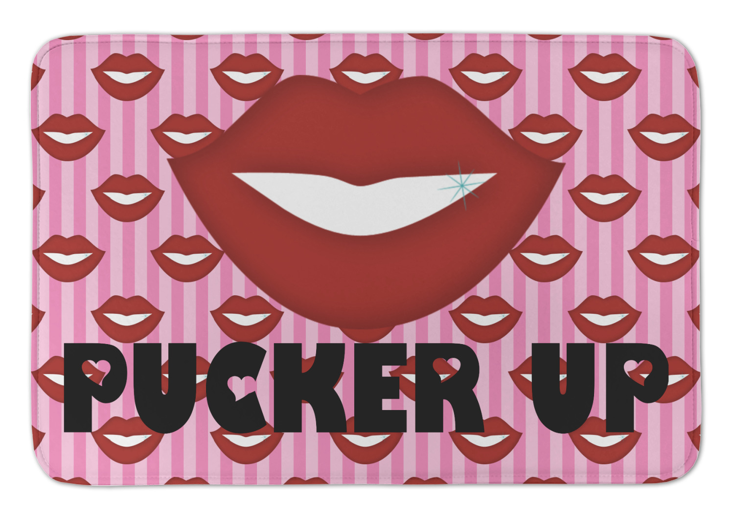 This Lips / Pucker Up design was created by very own Tina D'Astoli for her make up bag. We thought it was beautiful enough to convert to a full fledged design for all our products. It is a layered design with striped in the background (Tina of course chose pink; the stripes are re-color-able), layered with lips. Tina also chose to the use a large graphic and text layout - with lips and the words "Pucker Up" in a black with the Holes are Hearts font.