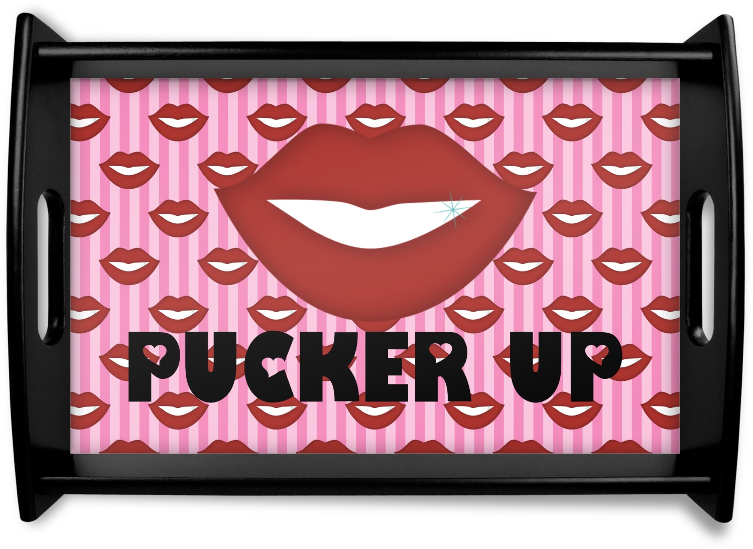 This Lips / Pucker Up design was created by very own Tina D'Astoli for her make up bag. We thought it was beautiful enough to convert to a full fledged design for all our products. It is a layered design with striped in the background (Tina of course chose pink; the stripes are re-color-able), layered with lips. Tina also chose to the use a large graphic and text layout - with lips and the words "Pucker Up" in a black with the Holes are Hearts font.