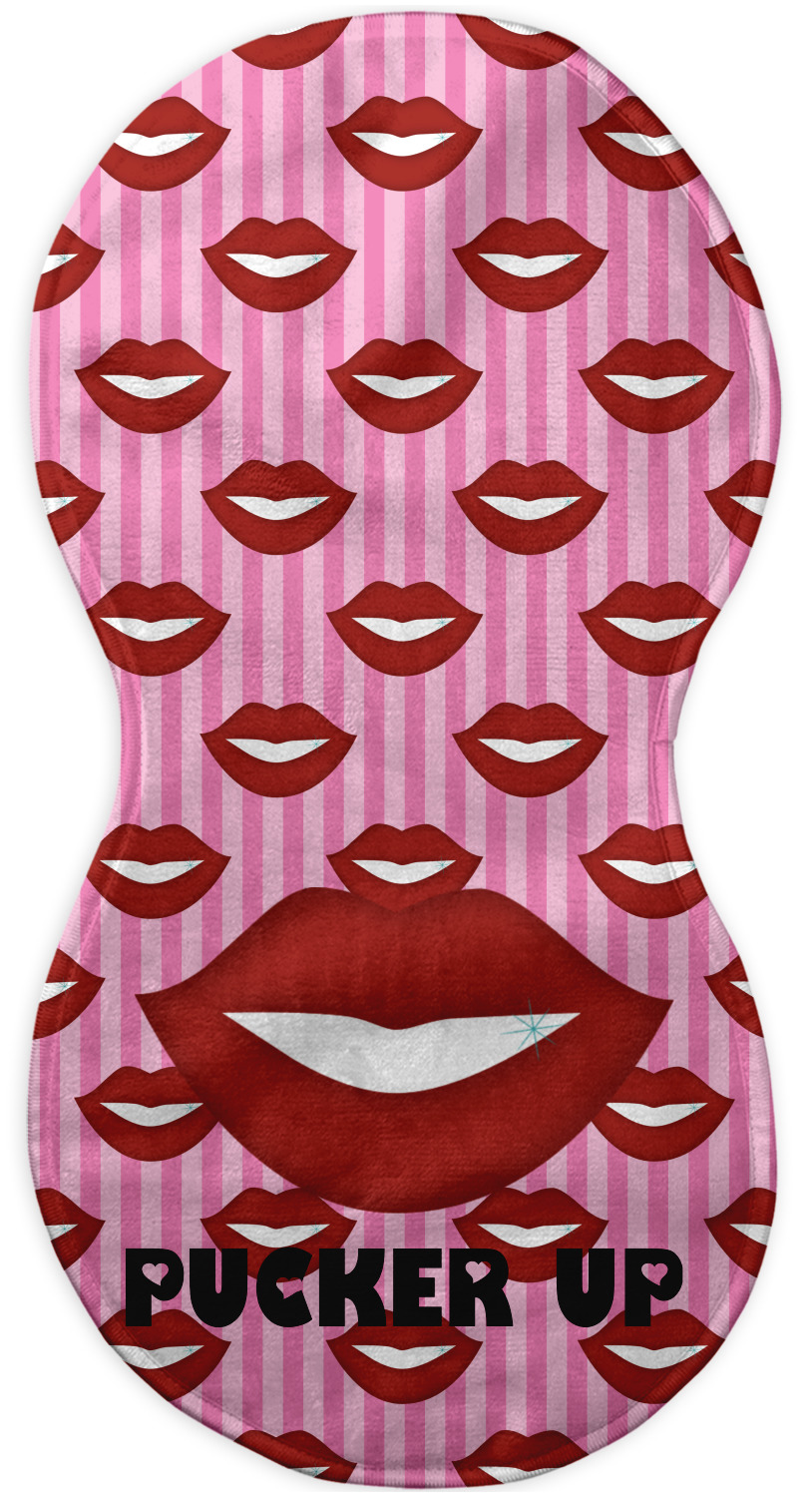 This Lips / Pucker Up design was created by very own Tina D'Astoli for her make up bag. We thought it was beautiful enough to convert to a full fledged design for all our products. It is a layered design with striped in the background (Tina of course chose pink; the stripes are re-color-able), layered with lips. Tina also chose to the use a large graphic and text layout - with lips and the words "Pucker Up" in a black with the Holes are Hearts font.