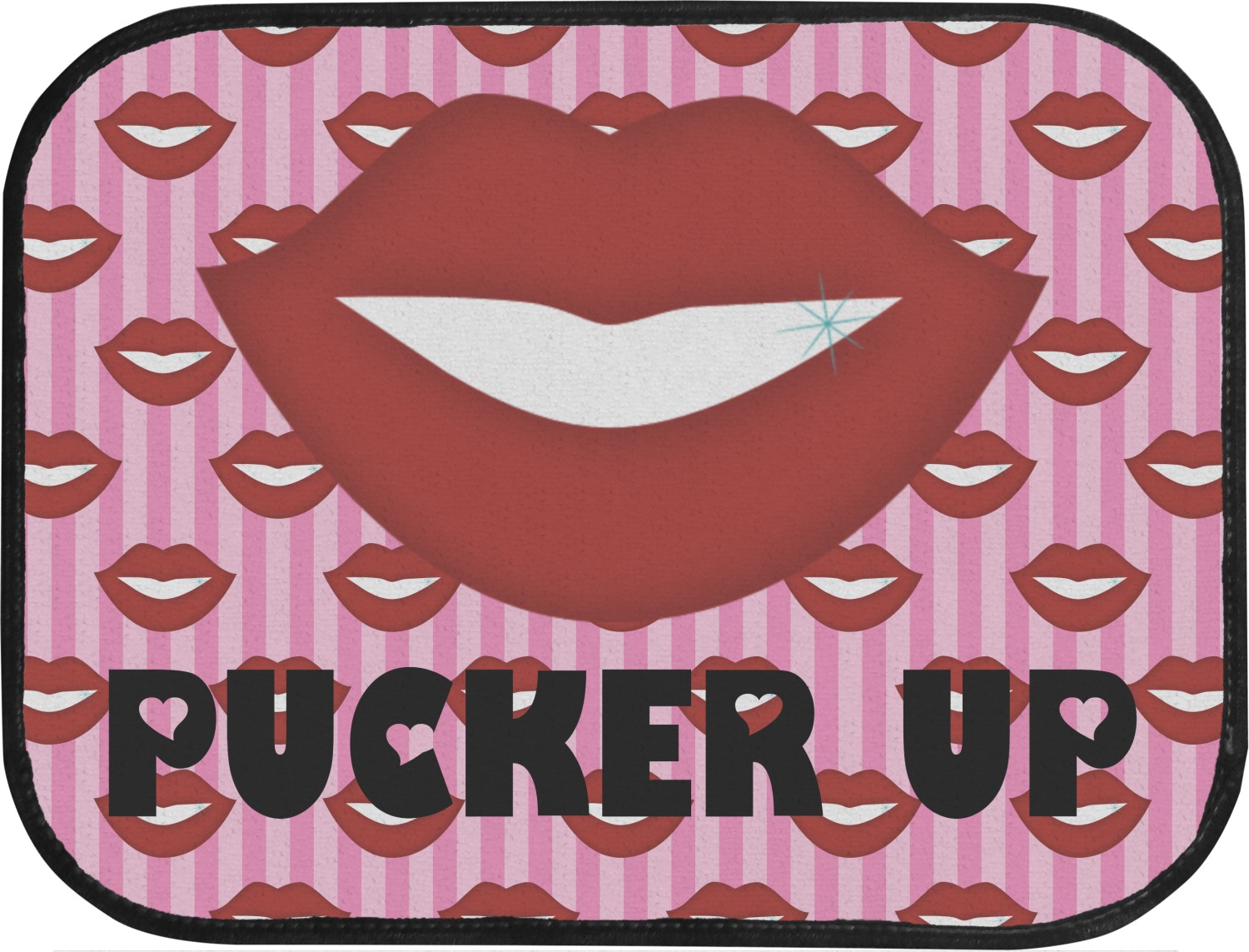 This Lips / Pucker Up design was created by very own Tina D'Astoli for her make up bag. We thought it was beautiful enough to convert to a full fledged design for all our products. It is a layered design with striped in the background (Tina of course chose pink; the stripes are re-color-able), layered with lips. Tina also chose to the use a large graphic and text layout - with lips and the words "Pucker Up" in a black with the Holes are Hearts font.