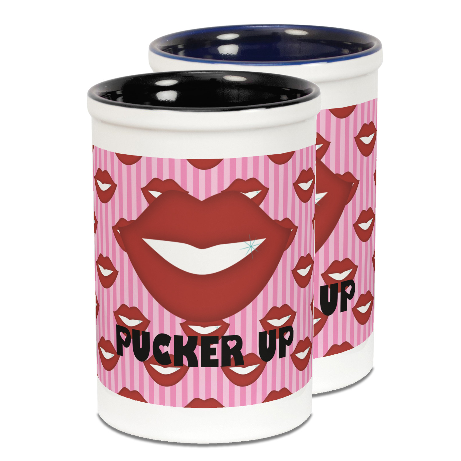 This Lips / Pucker Up design was created by very own Tina D'Astoli for her make up bag. We thought it was beautiful enough to convert to a full fledged design for all our products. It is a layered design with striped in the background (Tina of course chose pink; the stripes are re-color-able), layered with lips. Tina also chose to the use a large graphic and text layout - with lips and the words "Pucker Up" in a black with the Holes are Hearts font.