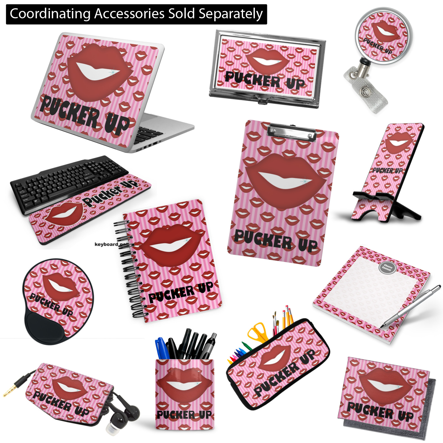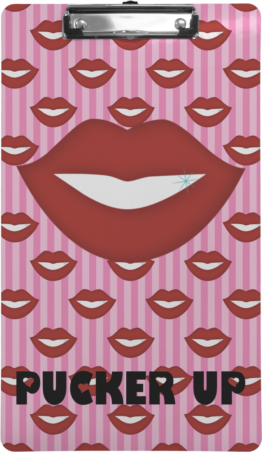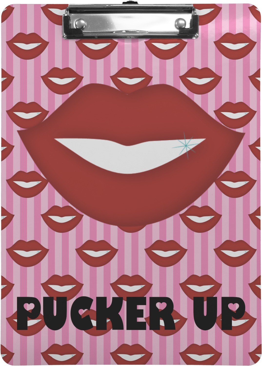 This Lips / Pucker Up design was created by very own Tina D'Astoli for her make up bag. We thought it was beautiful enough to convert to a full fledged design for all our products. It is a layered design with striped in the background (Tina of course chose pink; the stripes are re-color-able), layered with lips. Tina also chose to the use a large graphic and text layout - with lips and the words "Pucker Up" in a black with the Holes are Hearts font.