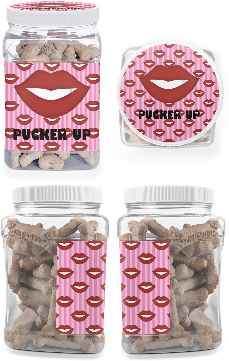 This half gallon jar, made from a sturdy plastic, is the perfect way to keep treats from any naughty pet paws, while still keeping them ready on hand for when your pup performs an impressive trick. This dog cookie jar features a screw-on, white lid that displays your personalized design on a vinyl sticker. We apply another customized sticker that wraps around the front and sides of the jar. Our dog treat jar also has indentations on the rear ends of the sides, which allows for convenient handling, and its square frame allows for easy storage.