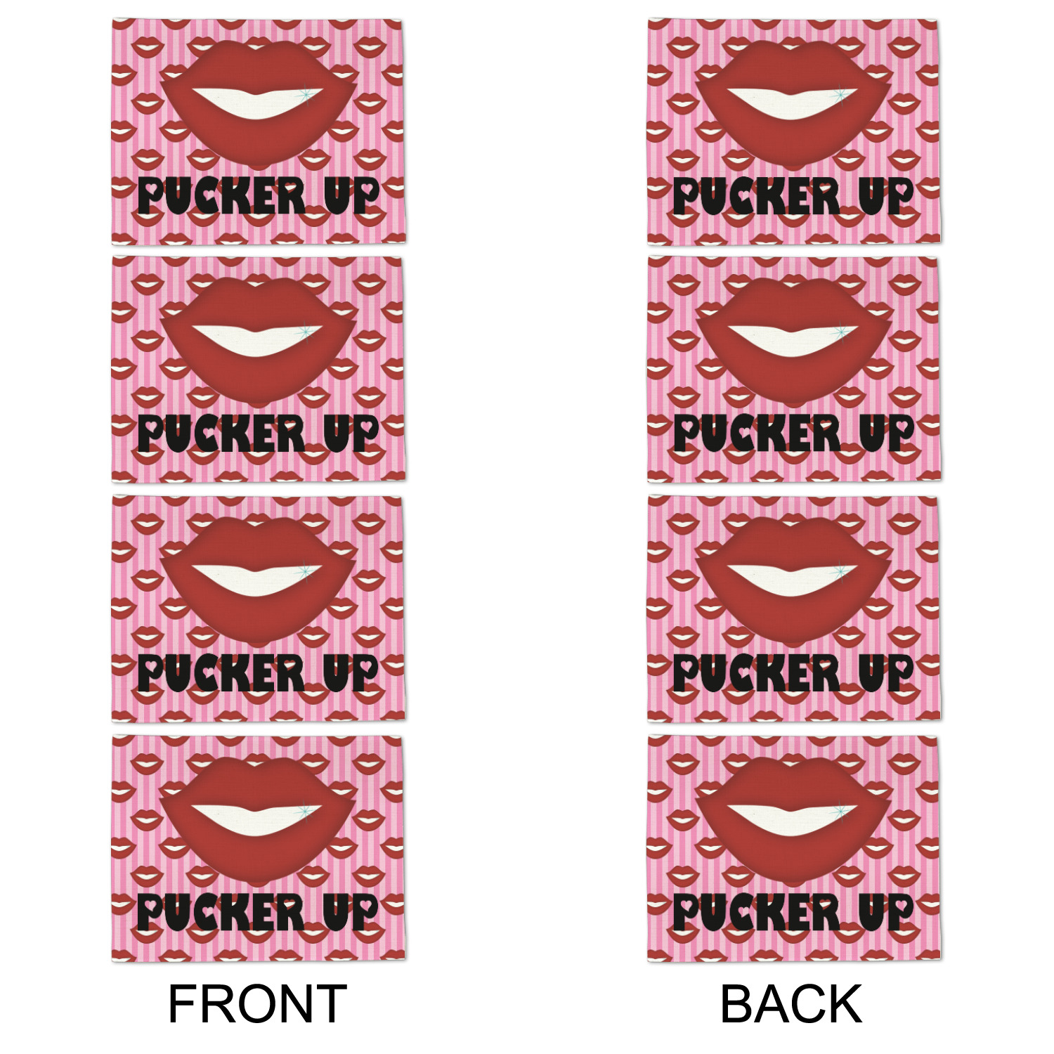 This Lips / Pucker Up design was created by very own Tina D'Astoli for her make up bag. We thought it was beautiful enough to convert to a full fledged design for all our products. It is a layered design with striped in the background (Tina of course chose pink; the stripes are re-color-able), layered with lips. Tina also chose to the use a large graphic and text layout - with lips and the words "Pucker Up" in a black with the Holes are Hearts font.