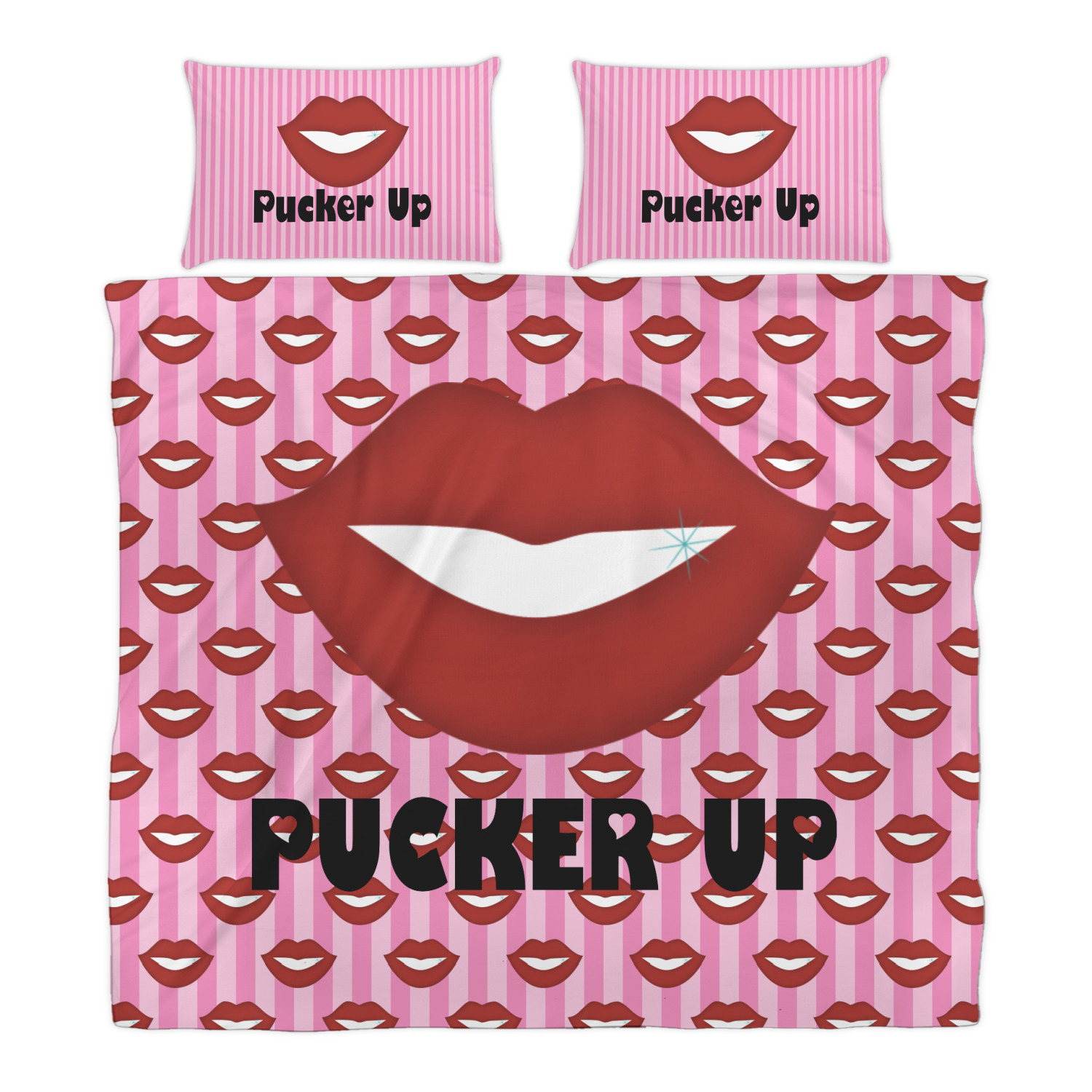 This Lips / Pucker Up design was created by very own Tina D'Astoli for her make up bag. We thought it was beautiful enough to convert to a full fledged design for all our products. It is a layered design with striped in the background (Tina of course chose pink; the stripes are re-color-able), layered with lips. Tina also chose to the use a large graphic and text layout - with lips and the words "Pucker Up" in a black with the Holes are Hearts font.
