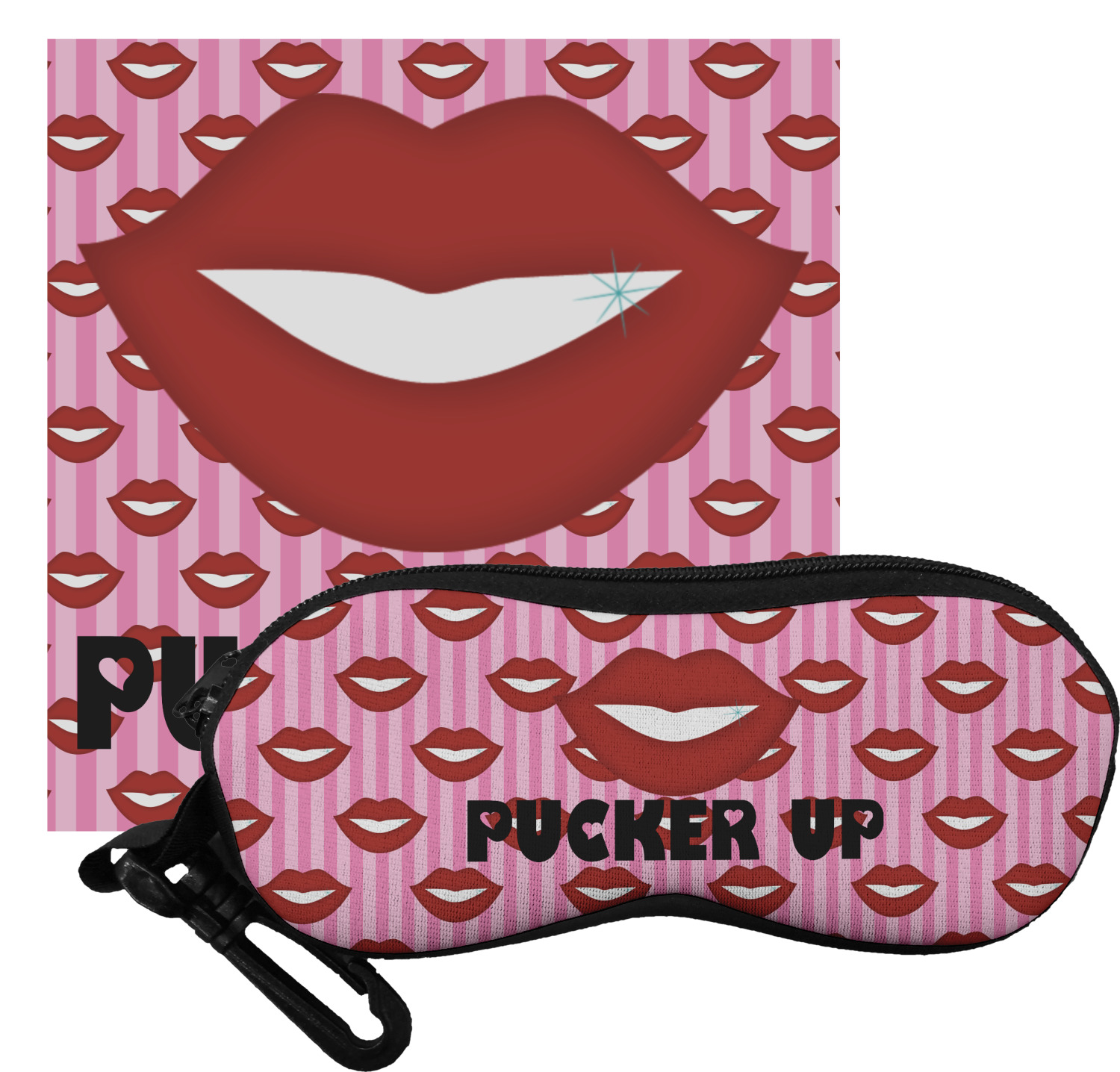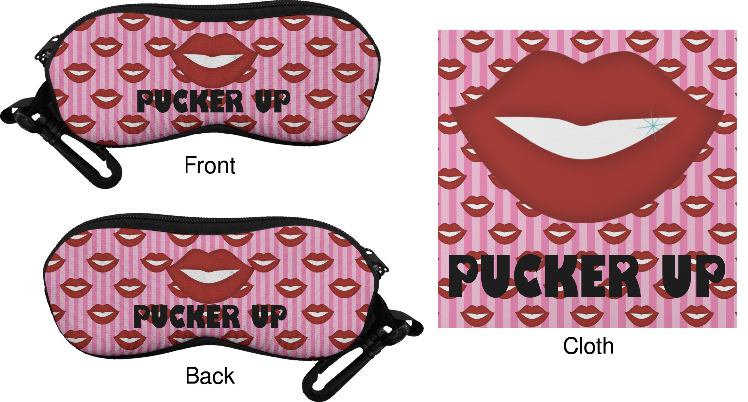 The cases have the design on both sides, a black zipper, and clips for hanging on a belt buckle or purse strap and also include matching lens cloths.