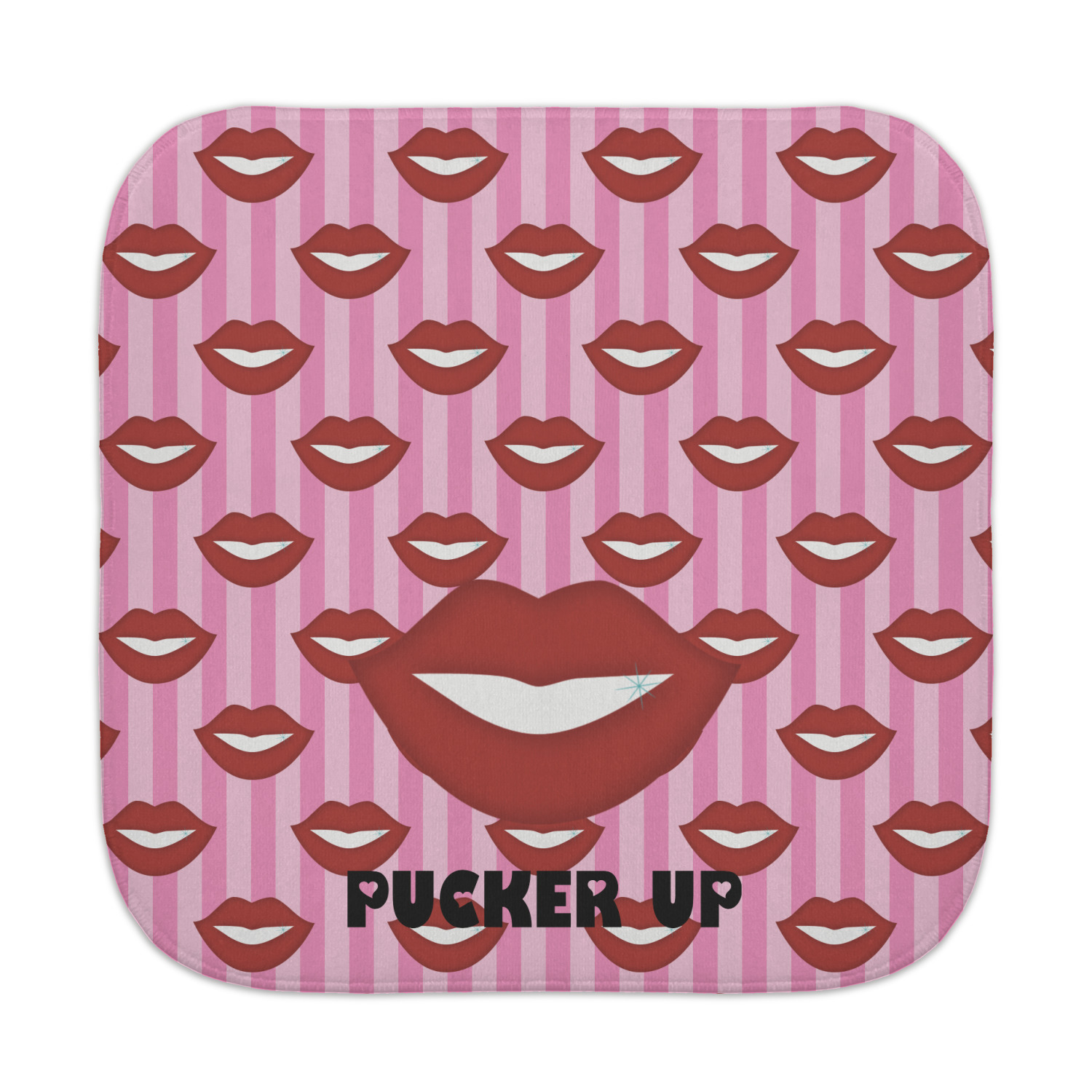 This Lips / Pucker Up design was created by very own Tina D'Astoli for her make up bag. We thought it was beautiful enough to convert to a full fledged design for all our products. It is a layered design with striped in the background (Tina of course chose pink; the stripes are re-color-able), layered with lips. Tina also chose to the use a large graphic and text layout - with lips and the words "Pucker Up" in a black with the Holes are Hearts font.
