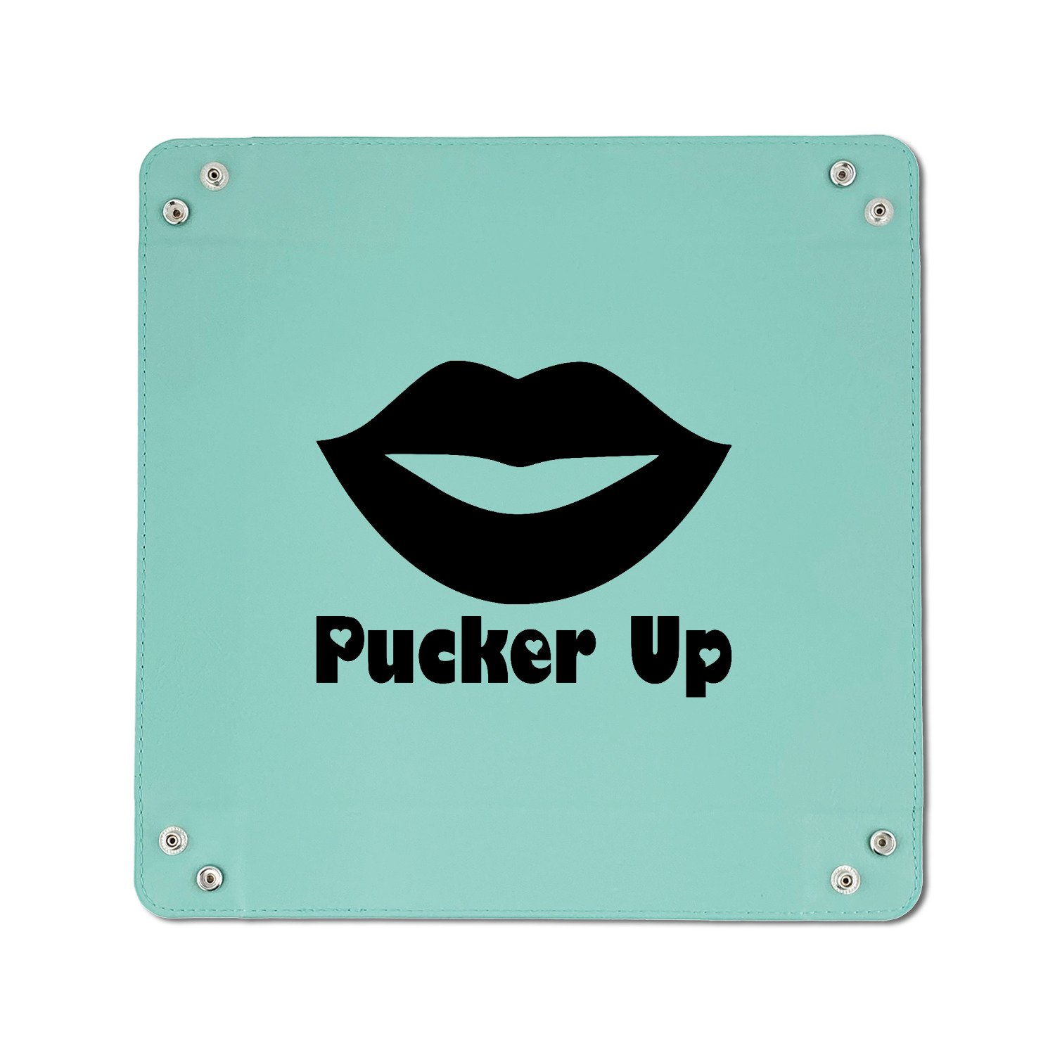 This Lips / Pucker Up design was created by very own Tina D'Astoli for her make up bag. We thought it was beautiful enough to convert to a full fledged design for all our products. It is a layered design with striped in the background (Tina of course chose pink; the stripes are re-color-able), layered with lips. Tina also chose to the use a large graphic and text layout - with lips and the words "Pucker Up" in a black with the Holes are Hearts font.