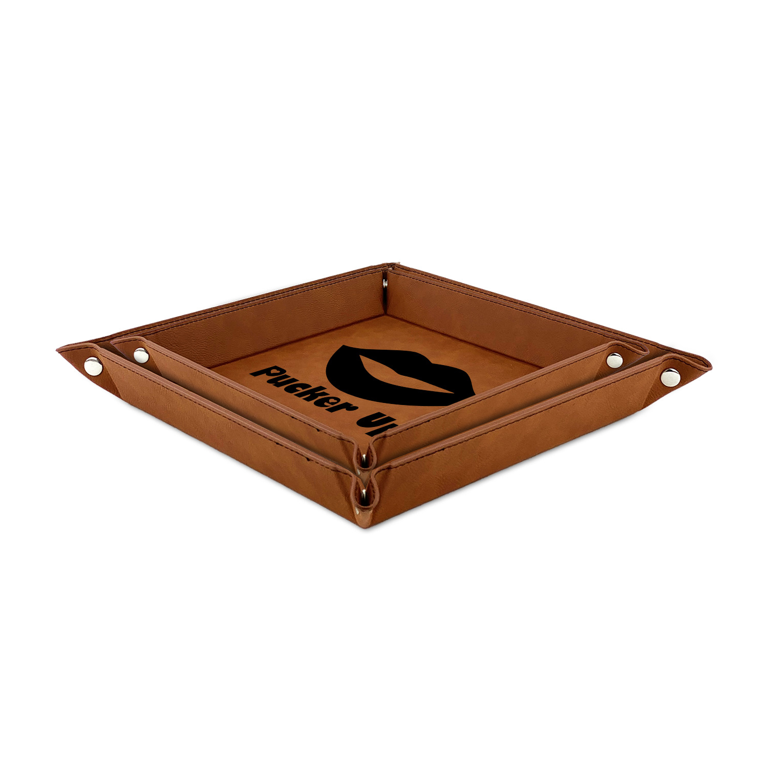 The leatherette wraps the hard board base and sides with flexible hinges to fold the sides up. The corners are secured using silver snaps. The 6in x 6 in tray measures approximately 9.5in x 9.5in when laid flat. The 9in x 9in tray measures approximately 13in x 13in when laid flat.
