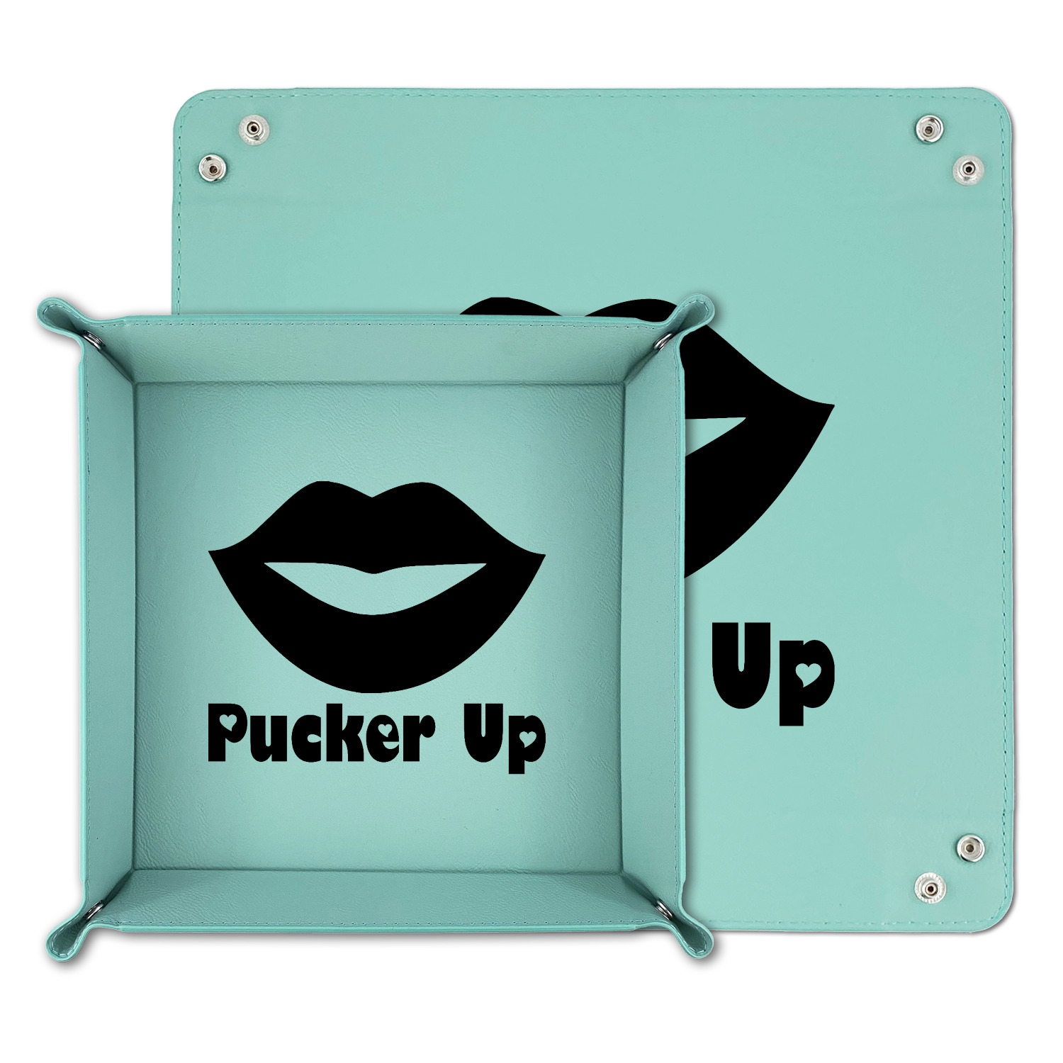 This Lips / Pucker Up design was created by very own Tina D'Astoli for her make up bag. We thought it was beautiful enough to convert to a full fledged design for all our products. It is a layered design with striped in the background (Tina of course chose pink; the stripes are re-color-able), layered with lips. Tina also chose to the use a large graphic and text layout - with lips and the words "Pucker Up" in a black with the Holes are Hearts font.