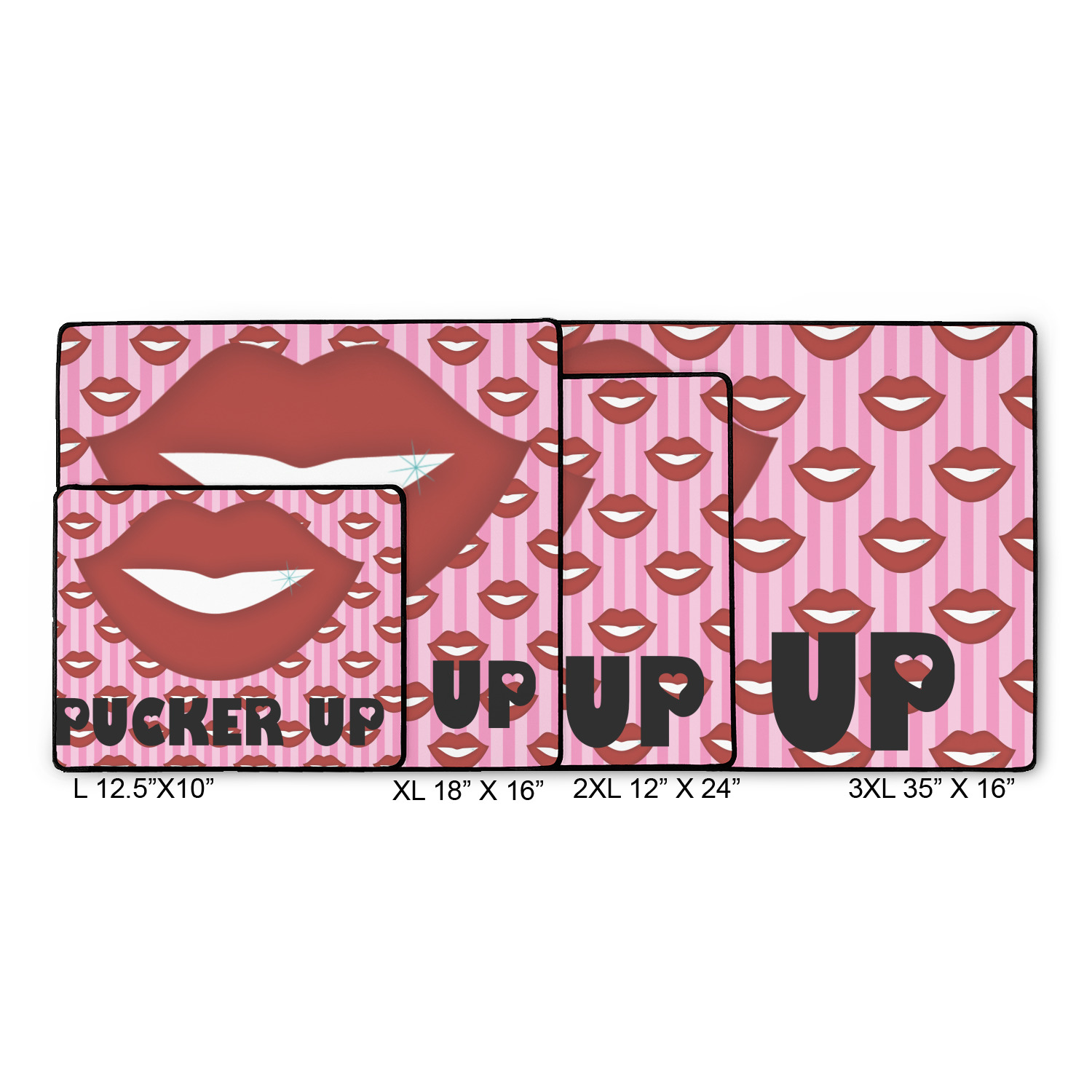 This Lips / Pucker Up design was created by very own Tina D'Astoli for her make up bag. We thought it was beautiful enough to convert to a full fledged design for all our products. It is a layered design with striped in the background (Tina of course chose pink; the stripes are re-color-able), layered with lips. Tina also chose to the use a large graphic and text layout - with lips and the words "Pucker Up" in a black with the Holes are Hearts font.