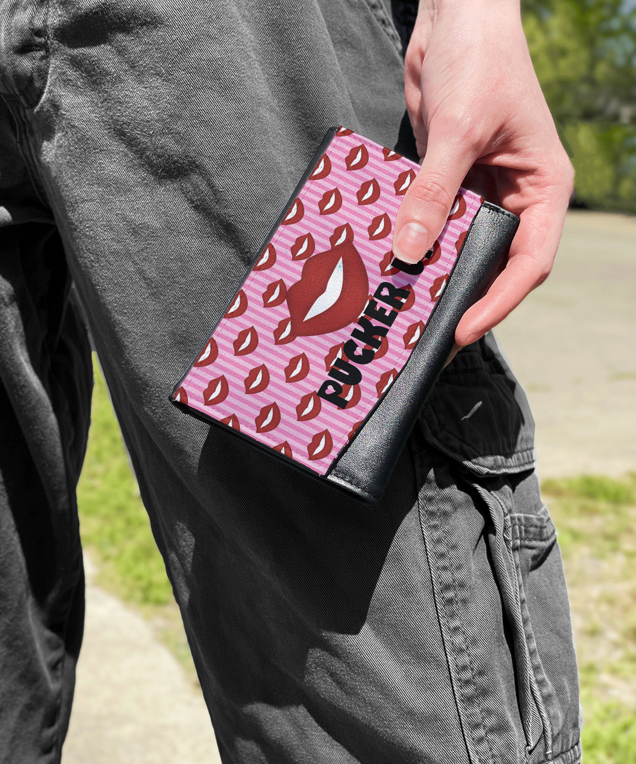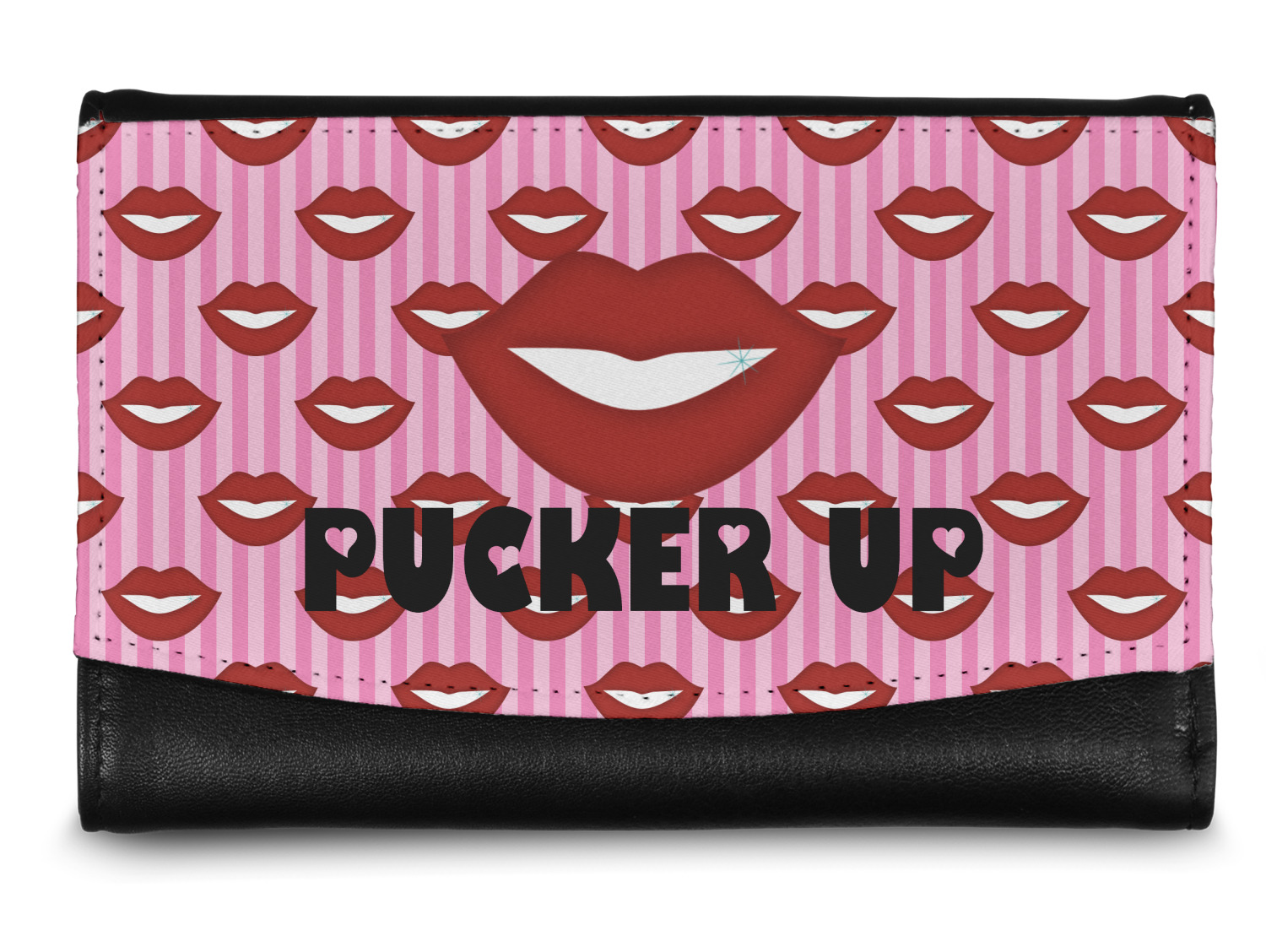This Lips / Pucker Up design was created by very own Tina D'Astoli for her make up bag. We thought it was beautiful enough to convert to a full fledged design for all our products. It is a layered design with striped in the background (Tina of course chose pink; the stripes are re-color-able), layered with lips. Tina also chose to the use a large graphic and text layout - with lips and the words "Pucker Up" in a black with the Holes are Hearts font.