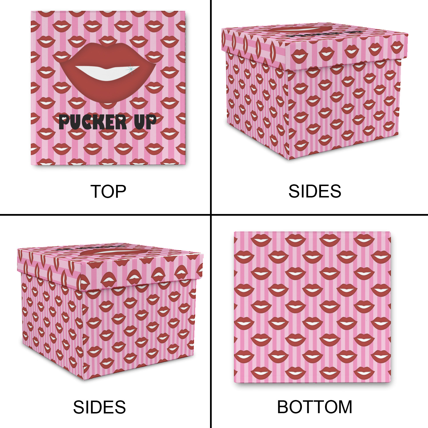 This Lips / Pucker Up design was created by very own Tina D'Astoli for her make up bag. We thought it was beautiful enough to convert to a full fledged design for all our products. It is a layered design with striped in the background (Tina of course chose pink; the stripes are re-color-able), layered with lips. Tina also chose to the use a large graphic and text layout - with lips and the words "Pucker Up" in a black with the Holes are Hearts font.