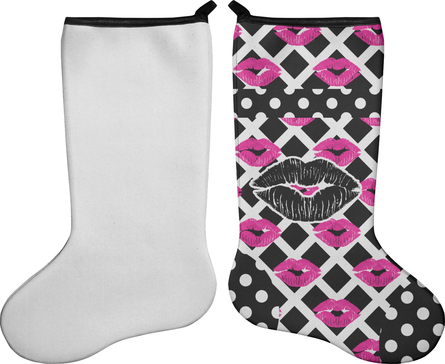 These 17" x 11" stockings are made of neoprene and have a black trim to give them a fantastic finished look. Your very own design is printed right onto the stocking, either single sided with white on the back or double sided where can use the same or different designs / patterns on the front and the back - the choice is yours. At the top of the stocking is a 2" loop for hanging.