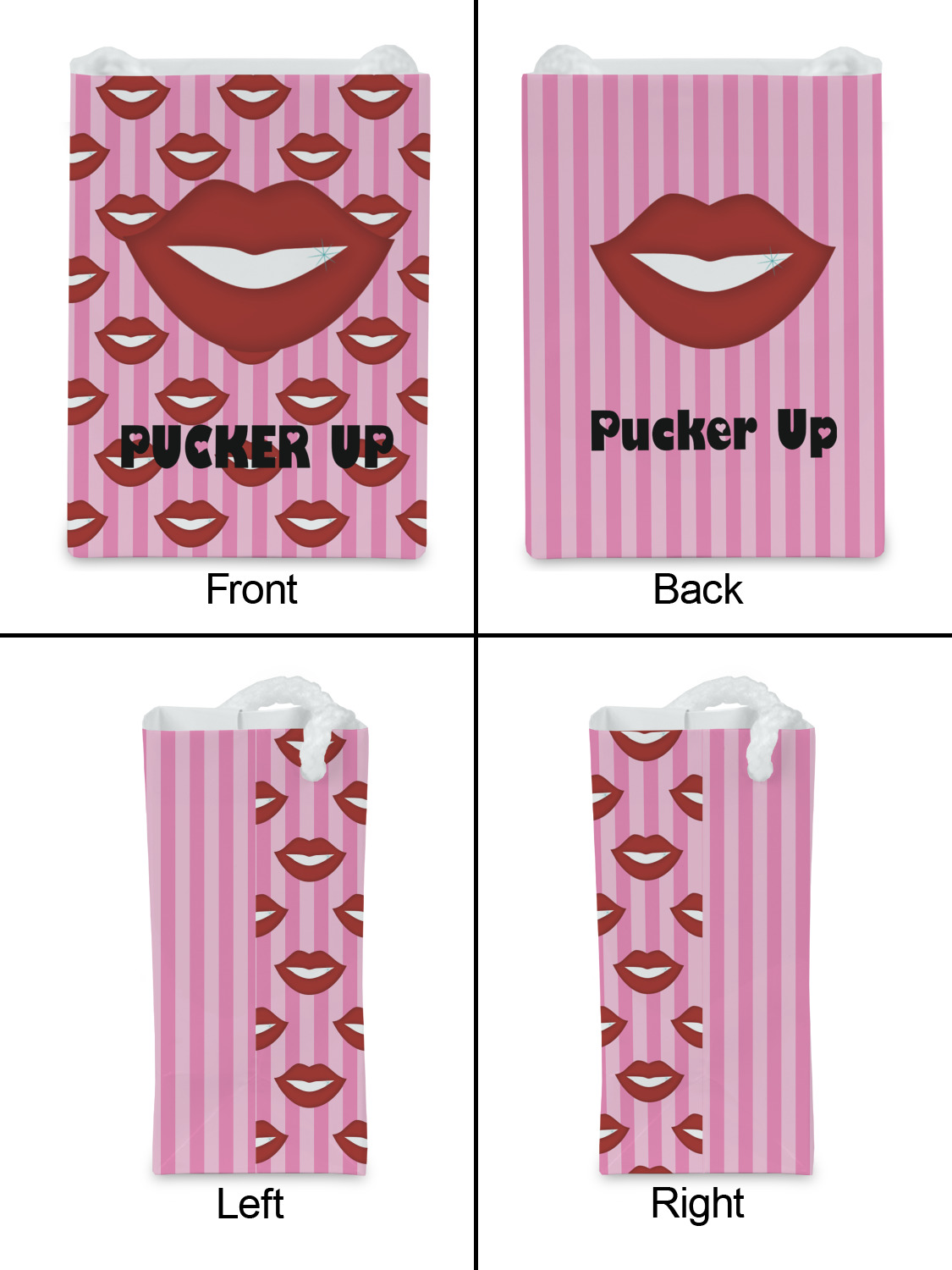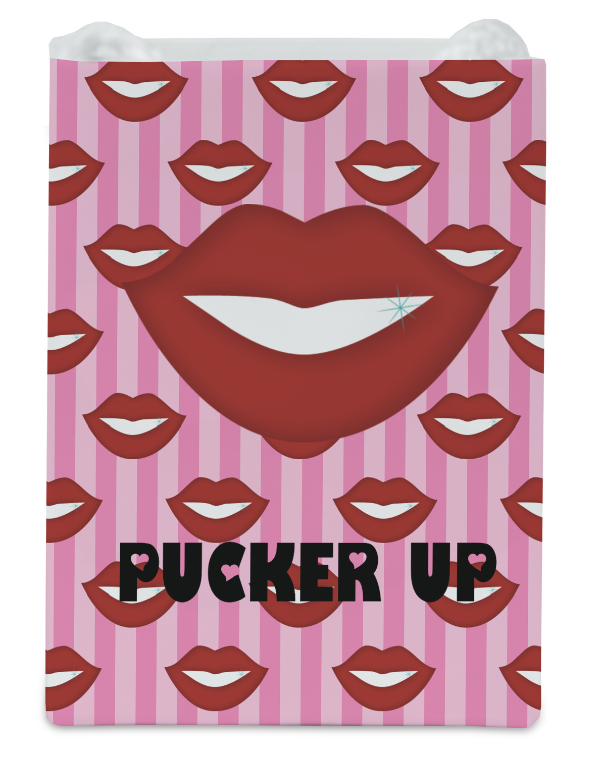 This Lips / Pucker Up design was created by very own Tina D'Astoli for her make up bag. We thought it was beautiful enough to convert to a full fledged design for all our products. It is a layered design with striped in the background (Tina of course chose pink; the stripes are re-color-able), layered with lips. Tina also chose to the use a large graphic and text layout - with lips and the words "Pucker Up" in a black with the Holes are Hearts font.