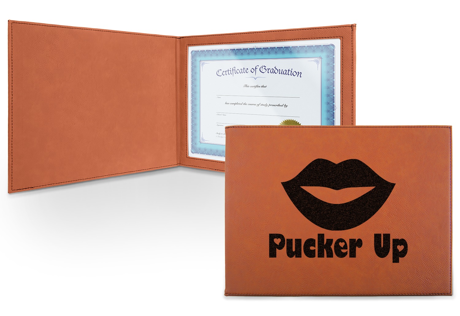 This cognac-colored, leatherette certificate jacket is the ideal way to display or store your hard-earned certificate. When closed, the custom certificate holder measures at 12 by 9 inches. The interior of the certificate cover includes a clear, vinyl window to encase your diploma. The window measures at around 10.5 by 7.5 inches and can accommodate a diploma that measures at up to 8.5 by 11 inches. You can either choose to have your customization laser engraved on the front and interior, or solely the front.