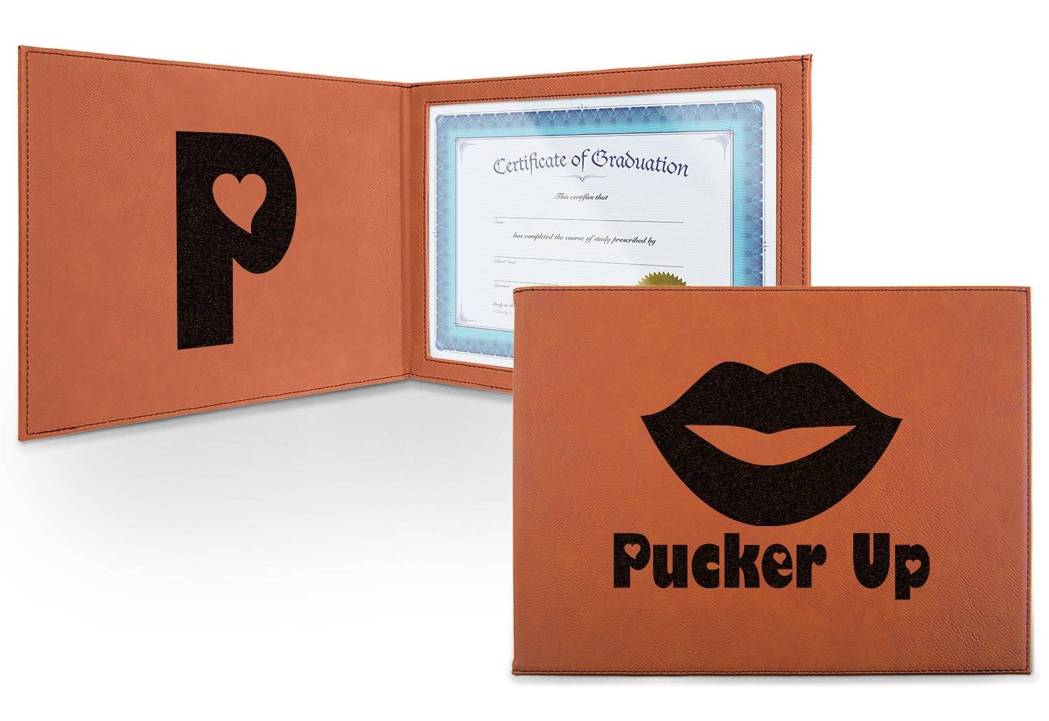 This cognac-colored, leatherette certificate jacket is the ideal way to display or store your hard-earned certificate. When closed, the custom certificate holder measures at 12 by 9 inches. The interior of the certificate cover includes a clear, vinyl window to encase your diploma. The window measures at around 10.5 by 7.5 inches and can accommodate a diploma that measures at up to 8.5 by 11 inches. You can either choose to have your customization laser engraved on the front and interior, or solely the front.