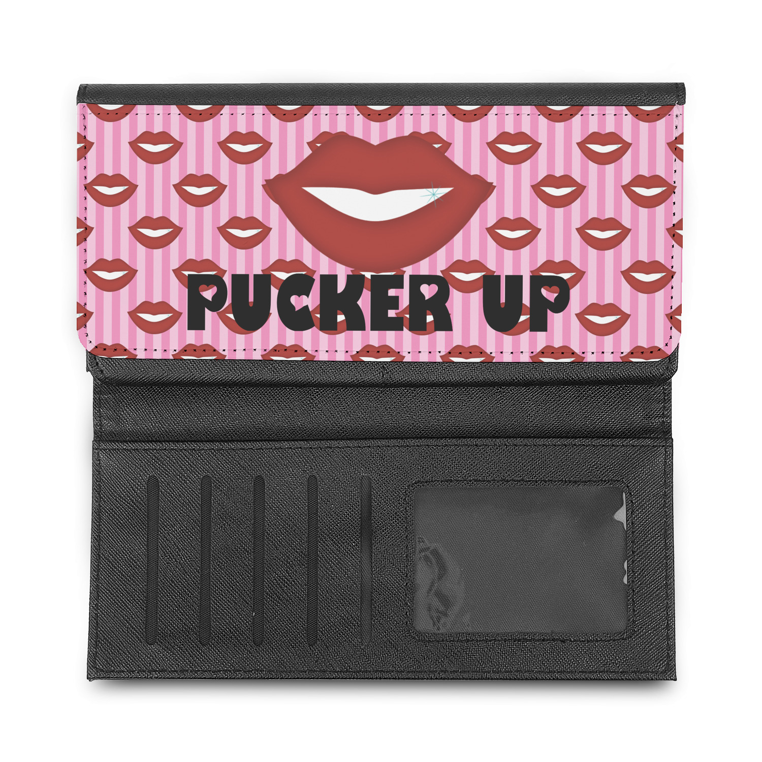 This Lips / Pucker Up design was created by very own Tina D'Astoli for her make up bag. We thought it was beautiful enough to convert to a full fledged design for all our products. It is a layered design with striped in the background (Tina of course chose pink; the stripes are re-color-able), layered with lips. Tina also chose to the use a large graphic and text layout - with lips and the words "Pucker Up" in a black with the Holes are Hearts font.
