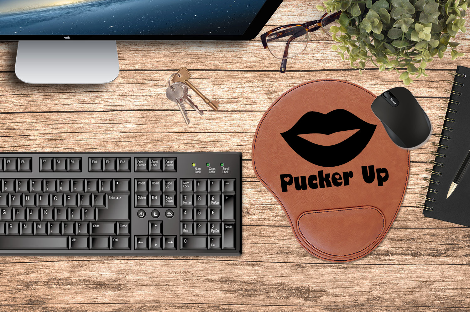 In a rounded shape, this mouse pad is made of a luxurious, cognac-colored leatherette. The nature of this material allows your mouse to glide smoothly across its surface. Strong stitching lines the edges to guarantee stability and strength. As added support for tired wrists, your personalized mouse pad features a supportive wrist rest at its bottom. This model measures at 10.25" x 9", while its wrist pad is approximately 5" x 2.75", with a thickness of 0.75". Your personalized design is laser engraved into the front face of this mouse pad.
