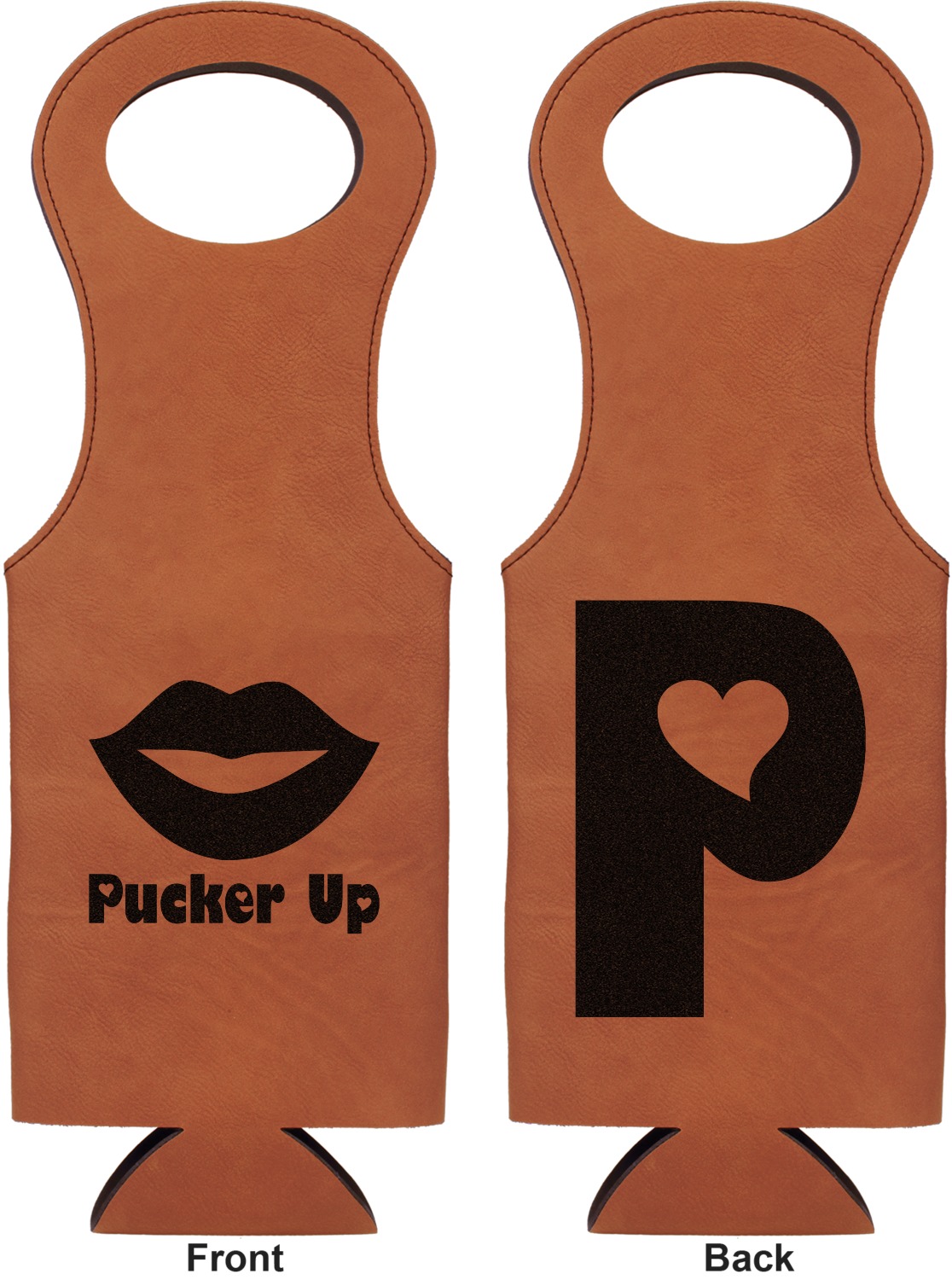 This wine carrier is made from a stunning leatherette, in a cognac-brown color. Strong, black stitching lines the sides of your wine bottle bag and provides extra durability. The interior is lined with a padded, black material to allow for a snug fit once your bottle is placed inside. At the top of this wine gift bag, you'll find two oval shaped handles that elegantly complements the rest of the bag's style. We provide you with the option of laser-engraving the front, or the front and back of your new personalized wine bag!
