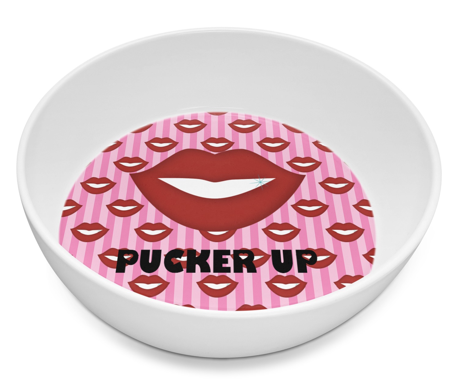 This Lips / Pucker Up design was created by very own Tina D'Astoli for her make up bag. We thought it was beautiful enough to convert to a full fledged design for all our products. It is a layered design with striped in the background (Tina of course chose pink; the stripes are re-color-able), layered with lips. Tina also chose to the use a large graphic and text layout - with lips and the words "Pucker Up" in a black with the Holes are Hearts font.