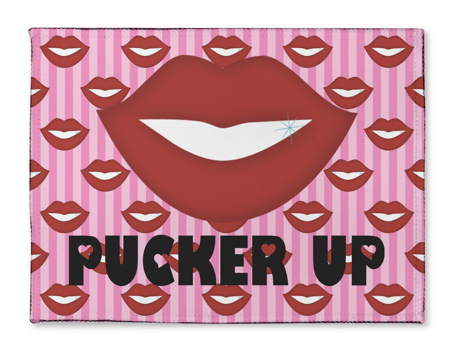 This Lips / Pucker Up design was created by very own Tina D'Astoli for her make up bag. We thought it was beautiful enough to convert to a full fledged design for all our products. It is a layered design with striped in the background (Tina of course chose pink; the stripes are re-color-able), layered with lips. Tina also chose to the use a large graphic and text layout - with lips and the words "Pucker Up" in a black with the Holes are Hearts font.