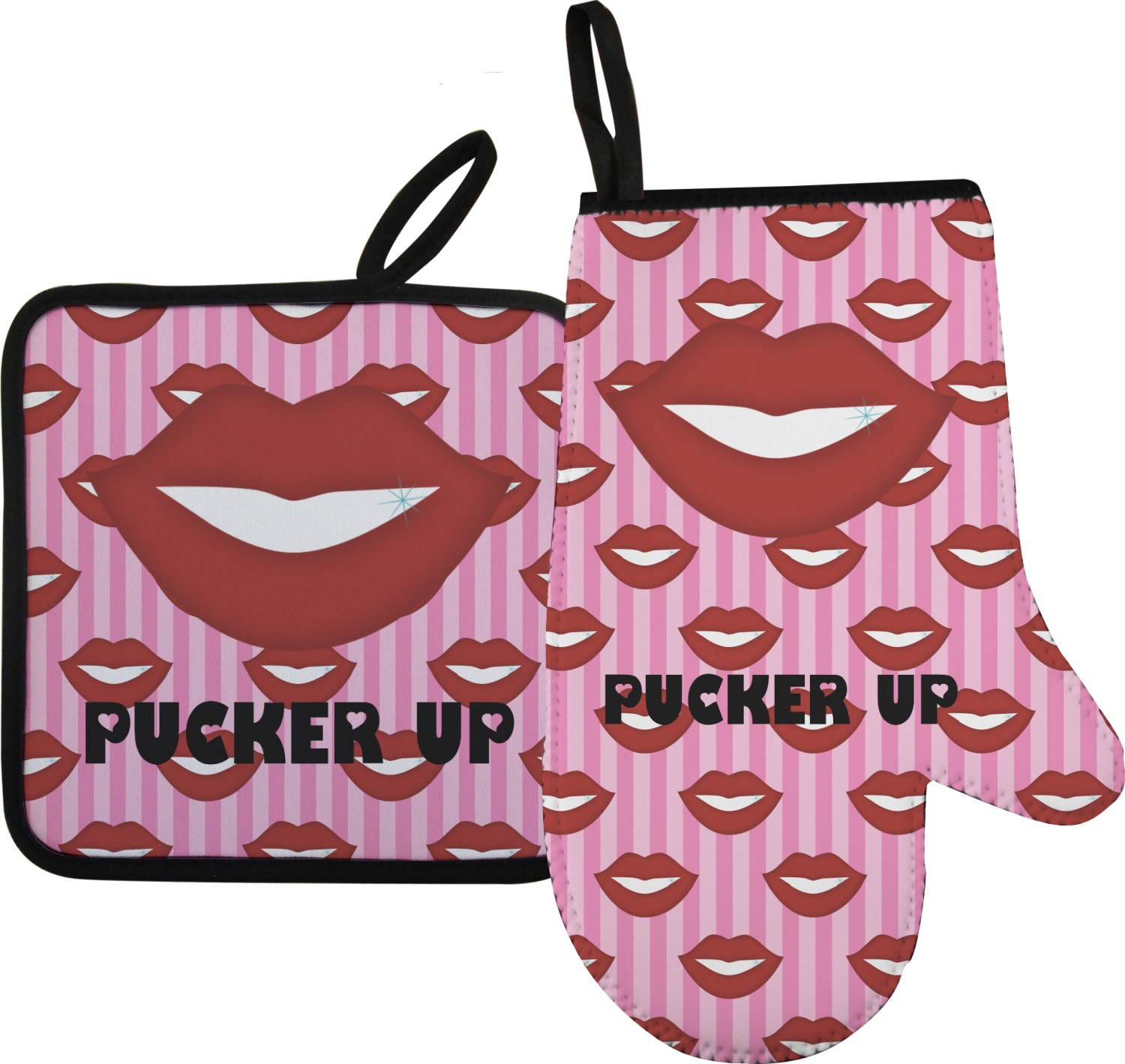 This Lips / Pucker Up design was created by very own Tina D'Astoli for her make up bag. We thought it was beautiful enough to convert to a full fledged design for all our products. It is a layered design with striped in the background (Tina of course chose pink; the stripes are re-color-able), layered with lips. Tina also chose to the use a large graphic and text layout - with lips and the words "Pucker Up" in a black with the Holes are Hearts font.