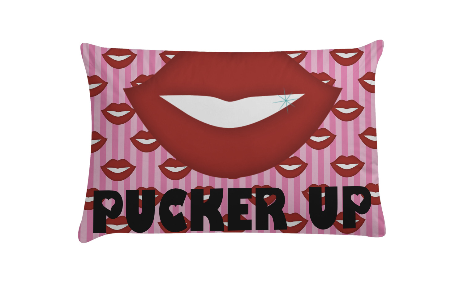 This Lips / Pucker Up design was created by very own Tina D'Astoli for her make up bag. We thought it was beautiful enough to convert to a full fledged design for all our products. It is a layered design with striped in the background (Tina of course chose pink; the stripes are re-color-able), layered with lips. Tina also chose to the use a large graphic and text layout - with lips and the words "Pucker Up" in a black with the Holes are Hearts font.