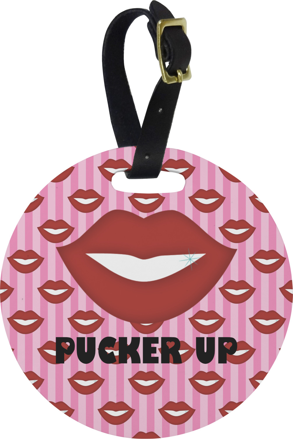 This Lips / Pucker Up design was created by very own Tina D'Astoli for her make up bag. We thought it was beautiful enough to convert to a full fledged design for all our products. It is a layered design with striped in the background (Tina of course chose pink; the stripes are re-color-able), layered with lips. Tina also chose to the use a large graphic and text layout - with lips and the words "Pucker Up" in a black with the Holes are Hearts font.