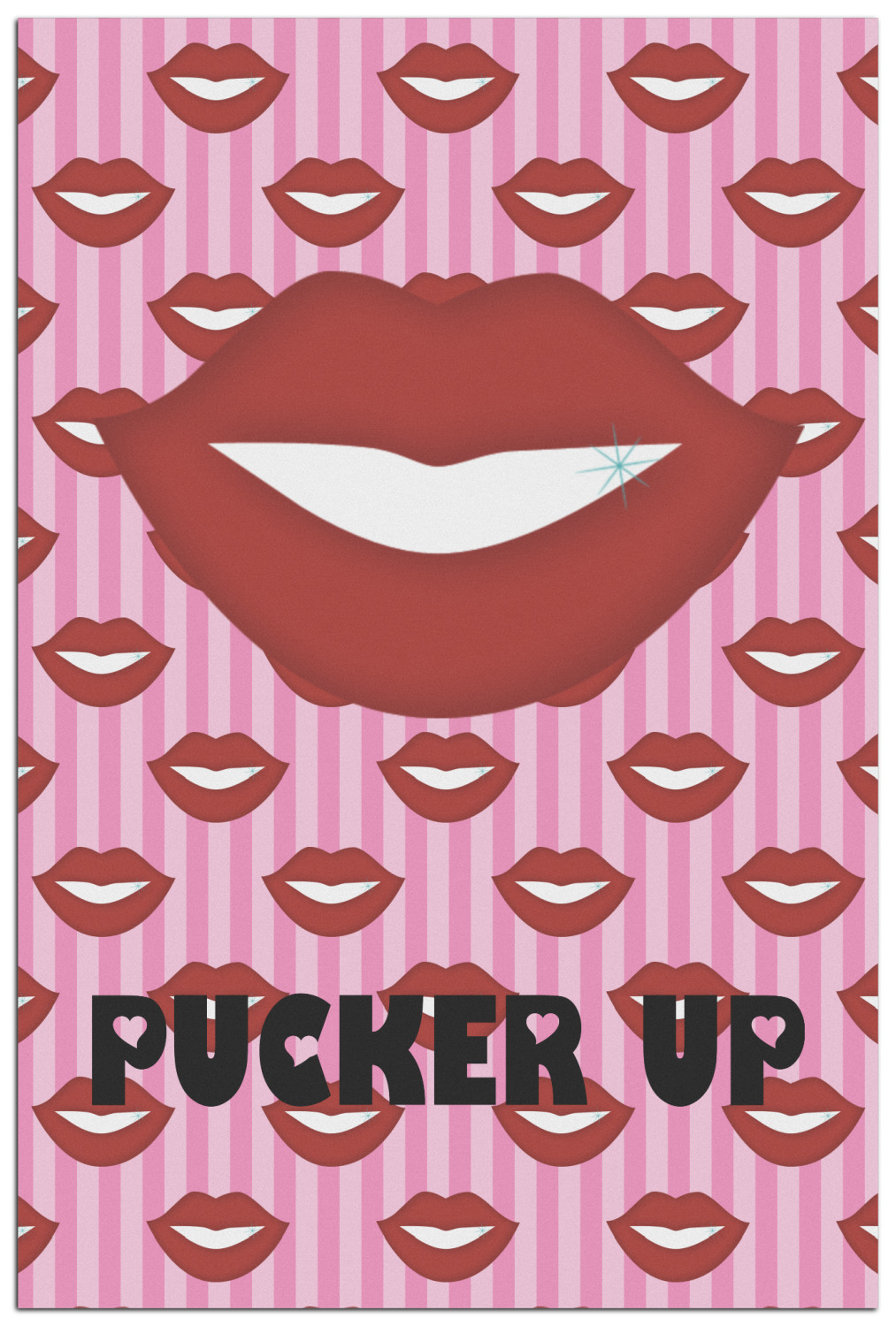 This Lips / Pucker Up design was created by very own Tina D'Astoli for her make up bag. We thought it was beautiful enough to convert to a full fledged design for all our products. It is a layered design with striped in the background (Tina of course chose pink; the stripes are re-color-able), layered with lips. Tina also chose to the use a large graphic and text layout - with lips and the words "Pucker Up" in a black with the Holes are Hearts font.