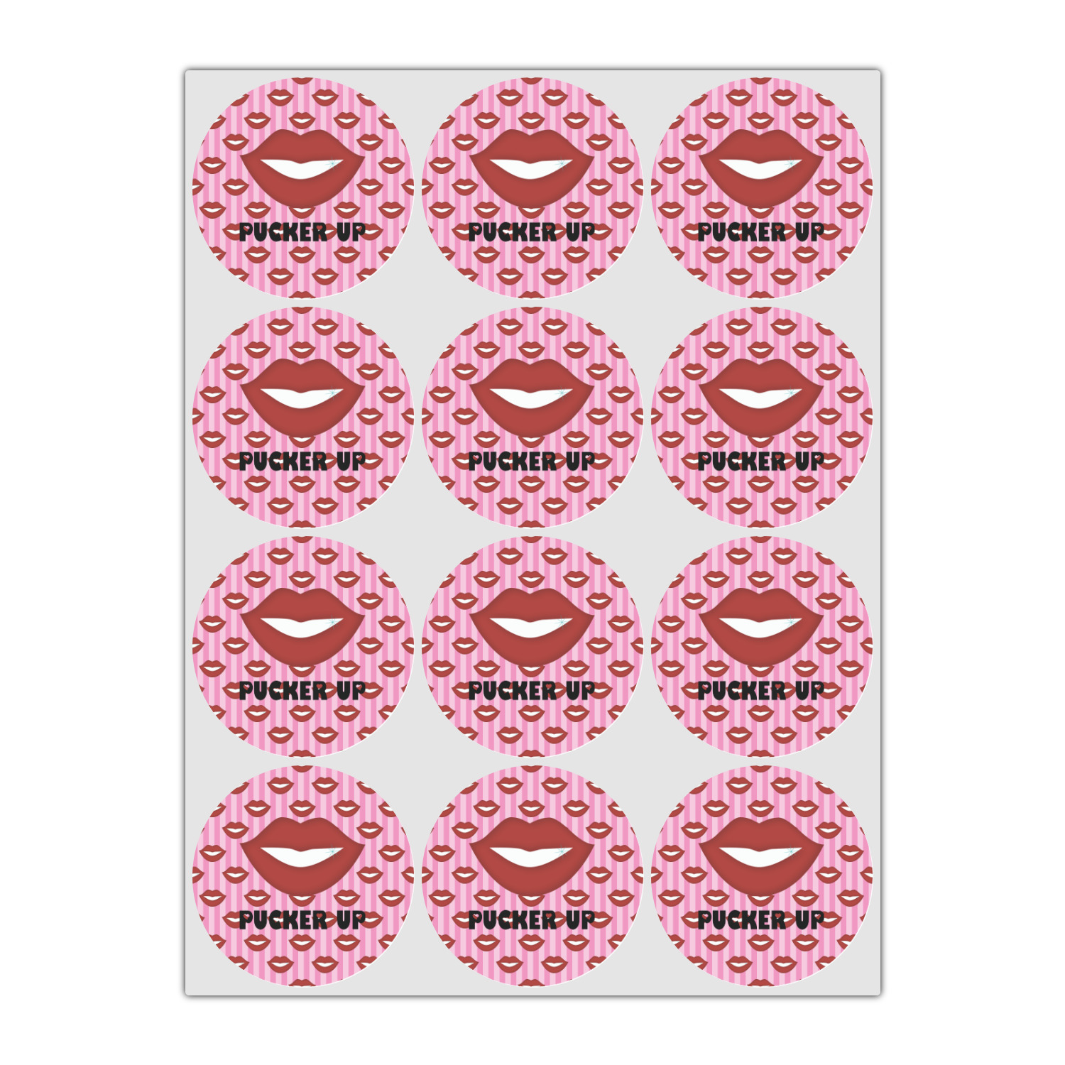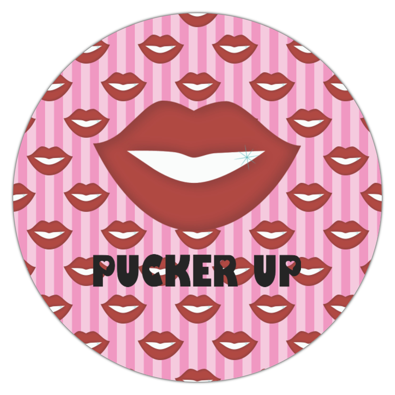 This Lips / Pucker Up design was created by very own Tina D'Astoli for her make up bag. We thought it was beautiful enough to convert to a full fledged design for all our products. It is a layered design with striped in the background (Tina of course chose pink; the stripes are re-color-able), layered with lips. Tina also chose to the use a large graphic and text layout - with lips and the words "Pucker Up" in a black with the Holes are Hearts font.