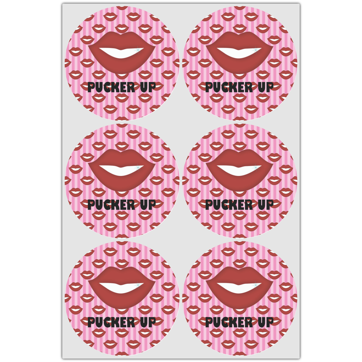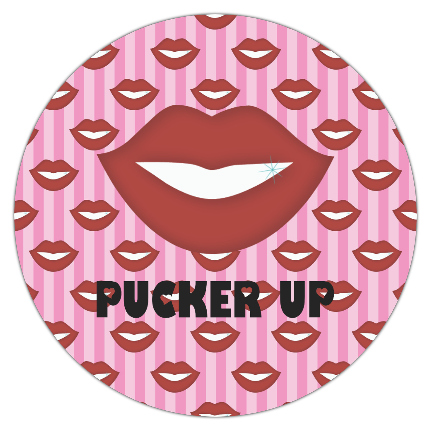 This Lips / Pucker Up design was created by very own Tina D'Astoli for her make up bag. We thought it was beautiful enough to convert to a full fledged design for all our products. It is a layered design with striped in the background (Tina of course chose pink; the stripes are re-color-able), layered with lips. Tina also chose to the use a large graphic and text layout - with lips and the words "Pucker Up" in a black with the Holes are Hearts font.