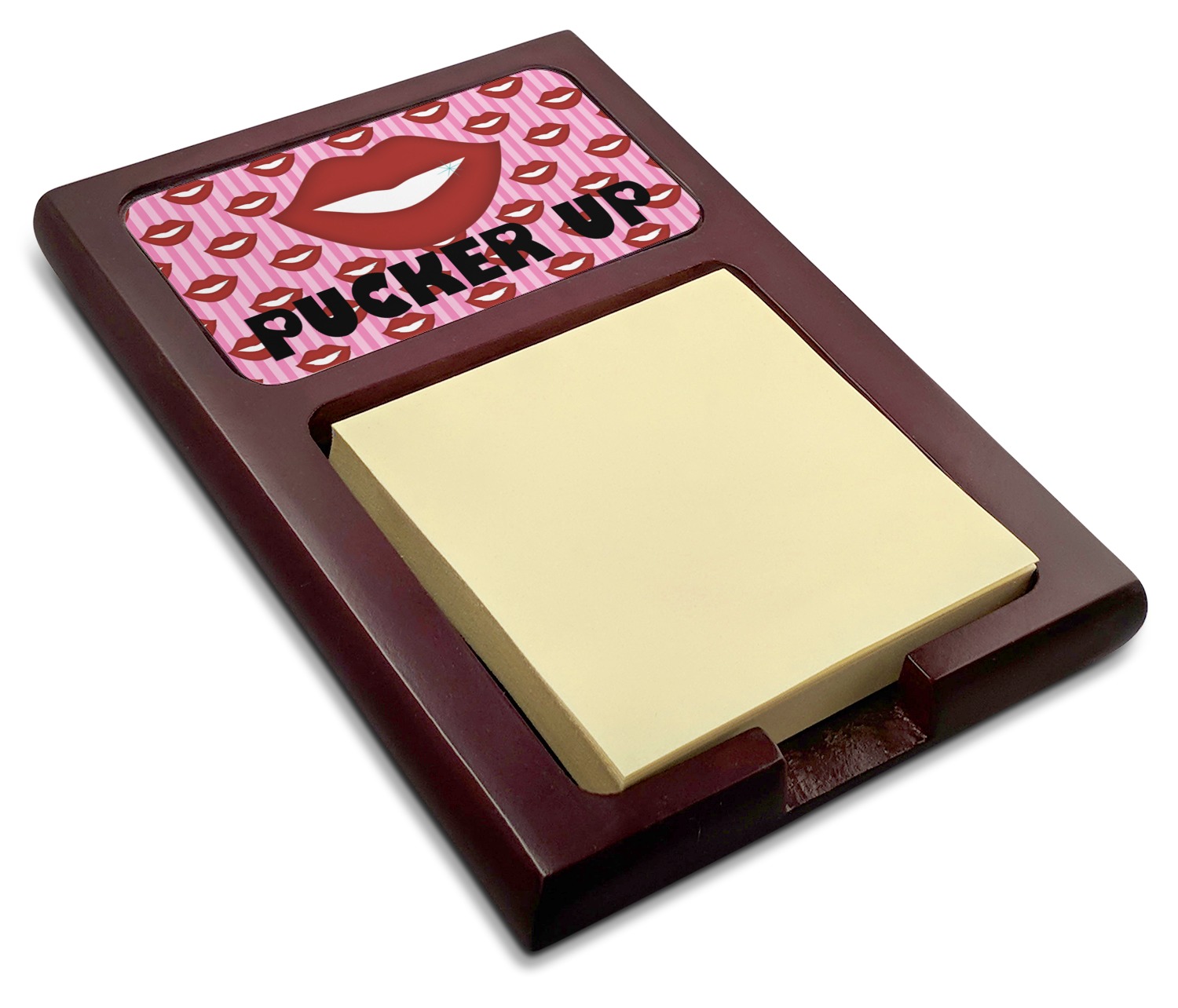Crafted from a fine mahogany, this post it note holder is in the shade of a dark, cherry color. The dispenser itself is about 4.25 by 6.25 by 0.75 inches. You can place your 3 by 3 inch sticky notes in the indentation below the nameplate. We print your customization onto the nameplate that rests above the velvety indentation.