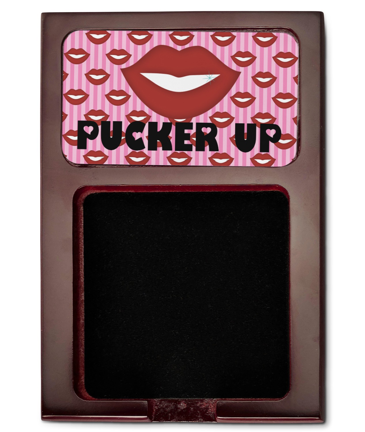 This Lips / Pucker Up design was created by very own Tina D'Astoli for her make up bag. We thought it was beautiful enough to convert to a full fledged design for all our products. It is a layered design with striped in the background (Tina of course chose pink; the stripes are re-color-able), layered with lips. Tina also chose to the use a large graphic and text layout - with lips and the words "Pucker Up" in a black with the Holes are Hearts font.