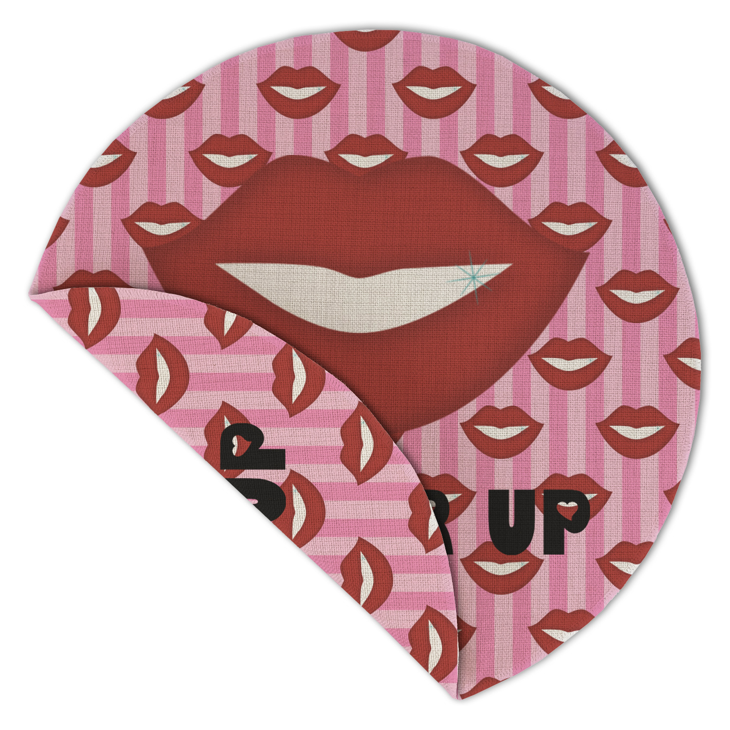 This Lips / Pucker Up design was created by very own Tina D'Astoli for her make up bag. We thought it was beautiful enough to convert to a full fledged design for all our products. It is a layered design with striped in the background (Tina of course chose pink; the stripes are re-color-able), layered with lips. Tina also chose to the use a large graphic and text layout - with lips and the words "Pucker Up" in a black with the Holes are Hearts font.